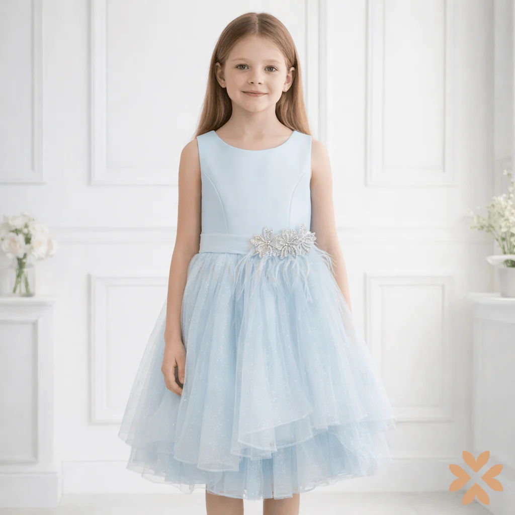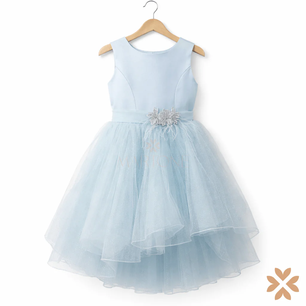 Il corpino in tessuto liscio azzurro cielo, dalla linea pulita e strutturata, valorizza la silhouette con raffinatezza essenziale. In vita, una fascia in tulle è impreziosita da un’importante applicazione gioiello floreale con delicati dettagli luminosi e leggere piume decorative, per un effetto ricercato e sofisticato.