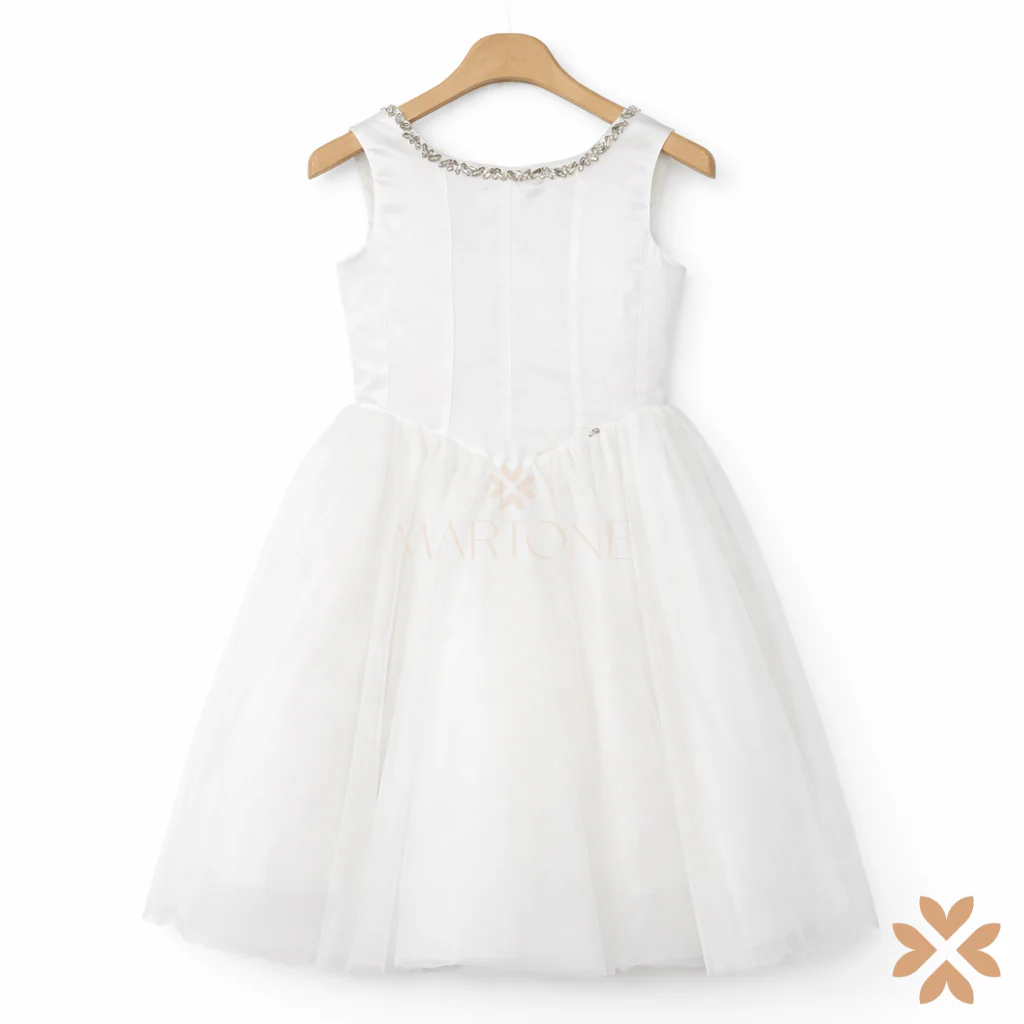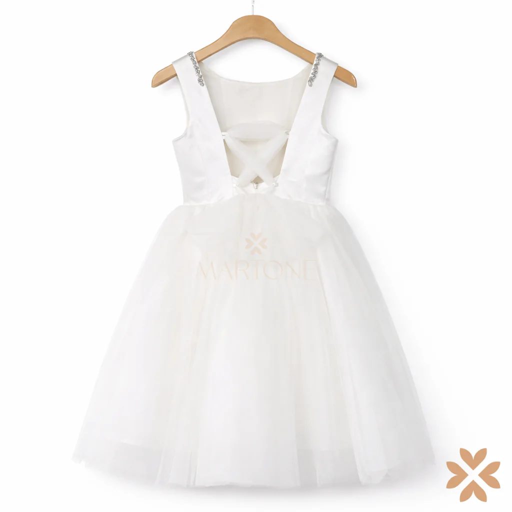 Sul retro, l’ampia scollatura a V con intreccio in tulle crea un dettaglio scenografico e sofisticato, aggiungendo leggerezza e ricercatezza alla silhouette. La gonna ampia in tulle si apre in volumi soffici e armoniosi, donando movimento e una presenza eterea ad ogni passo.