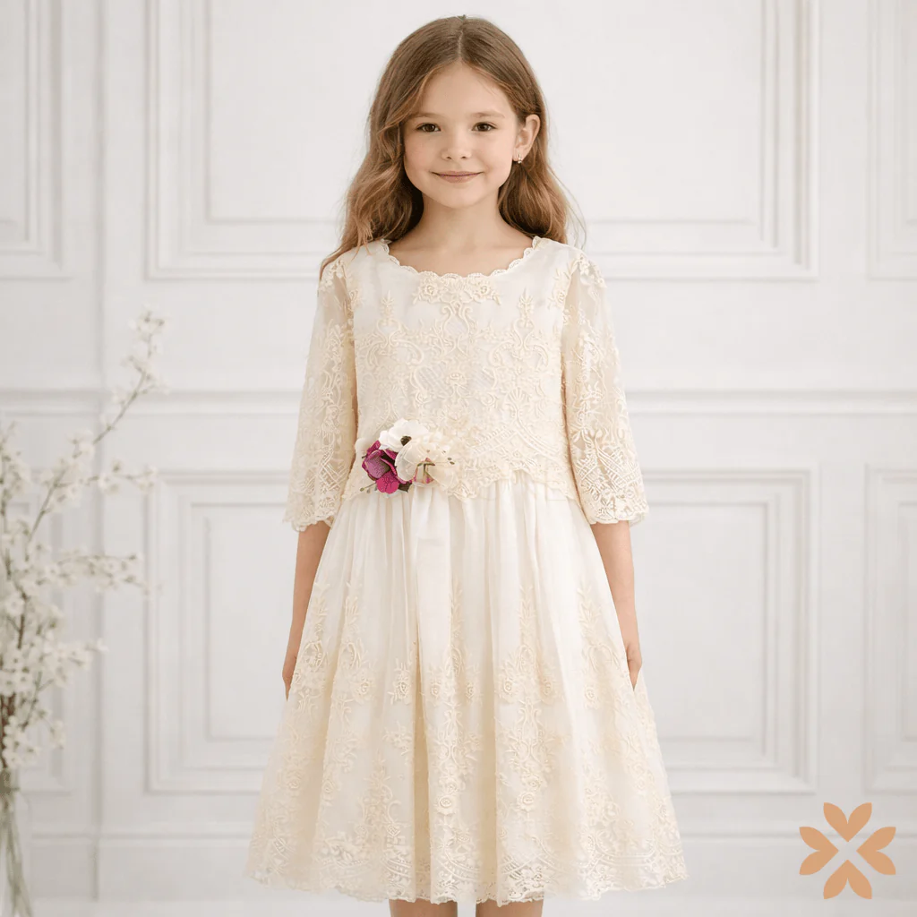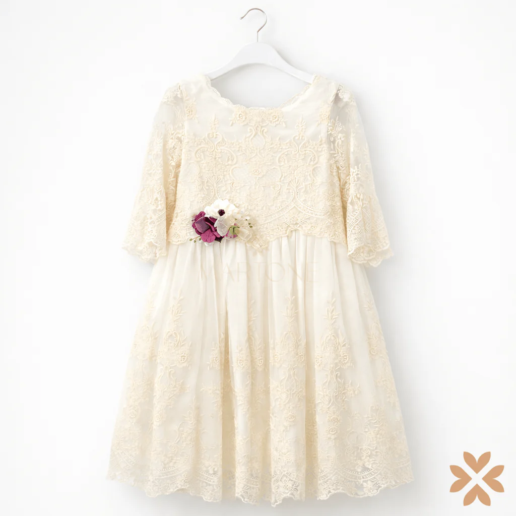 Il corpino in pizzo ricamato color avorio è impreziosito da delicati motivi floreali e da una scollatura morbida rifinita con bordo smerlato. Le maniche a tre quarti in pizzo trasparente donano eleganza e leggerezza, creando un equilibrio armonioso tra tradizione e ricercatezza.