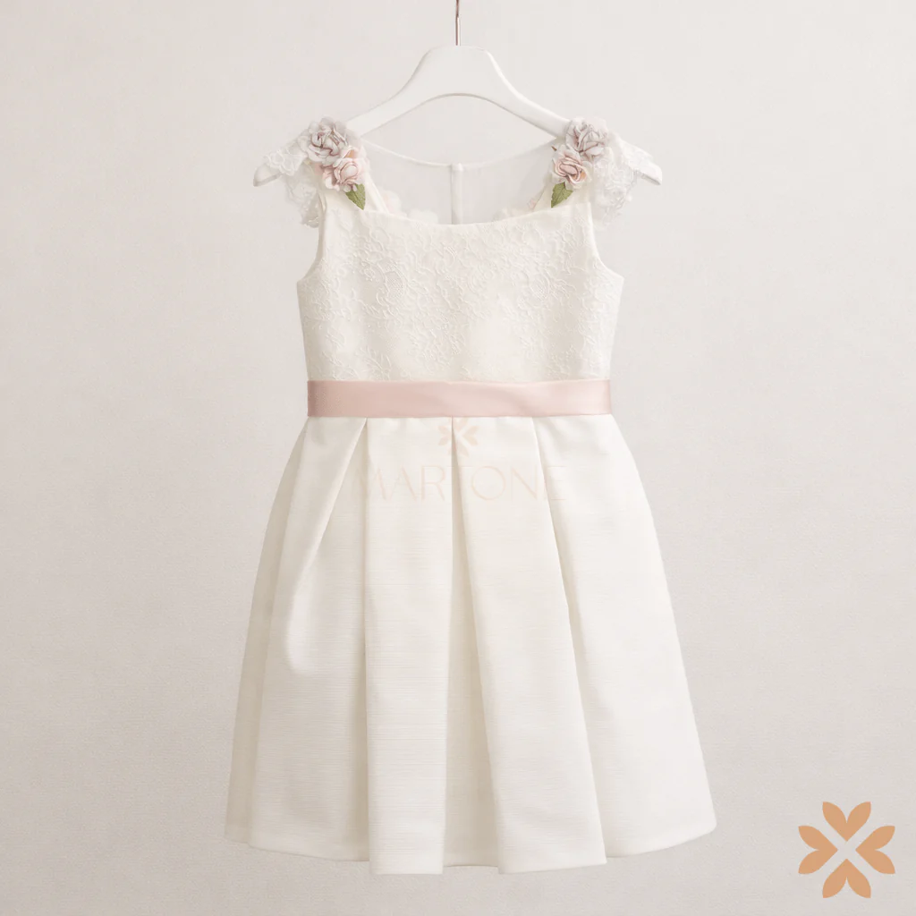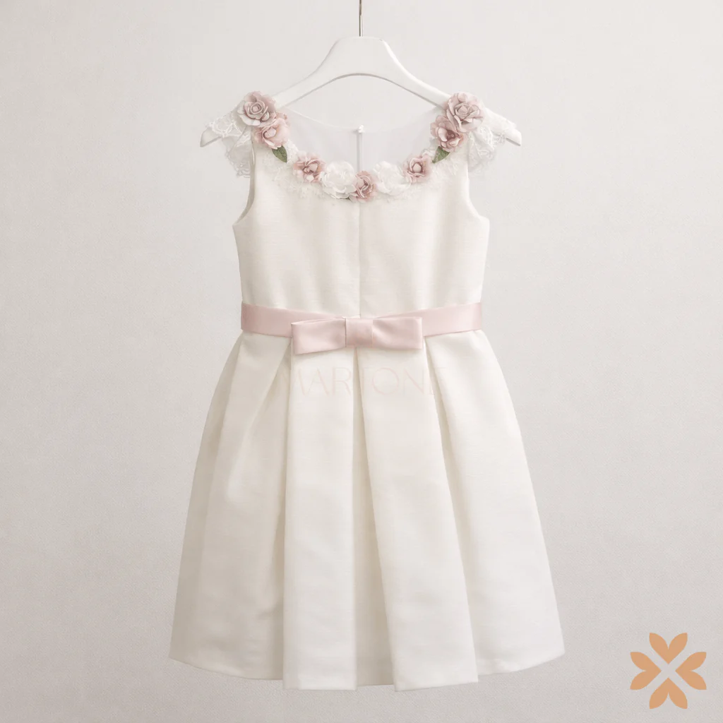 Abito da cerimonia per bambina dallo stile essenziale e raffinato, realizzato in elegante tonalità avorio. Il design è valorizzato da un corpino pulito con scollo arrotondato, impreziosito da delicati fiori applicati lungo il girocollo che donano un tocco romantico e distintivo.