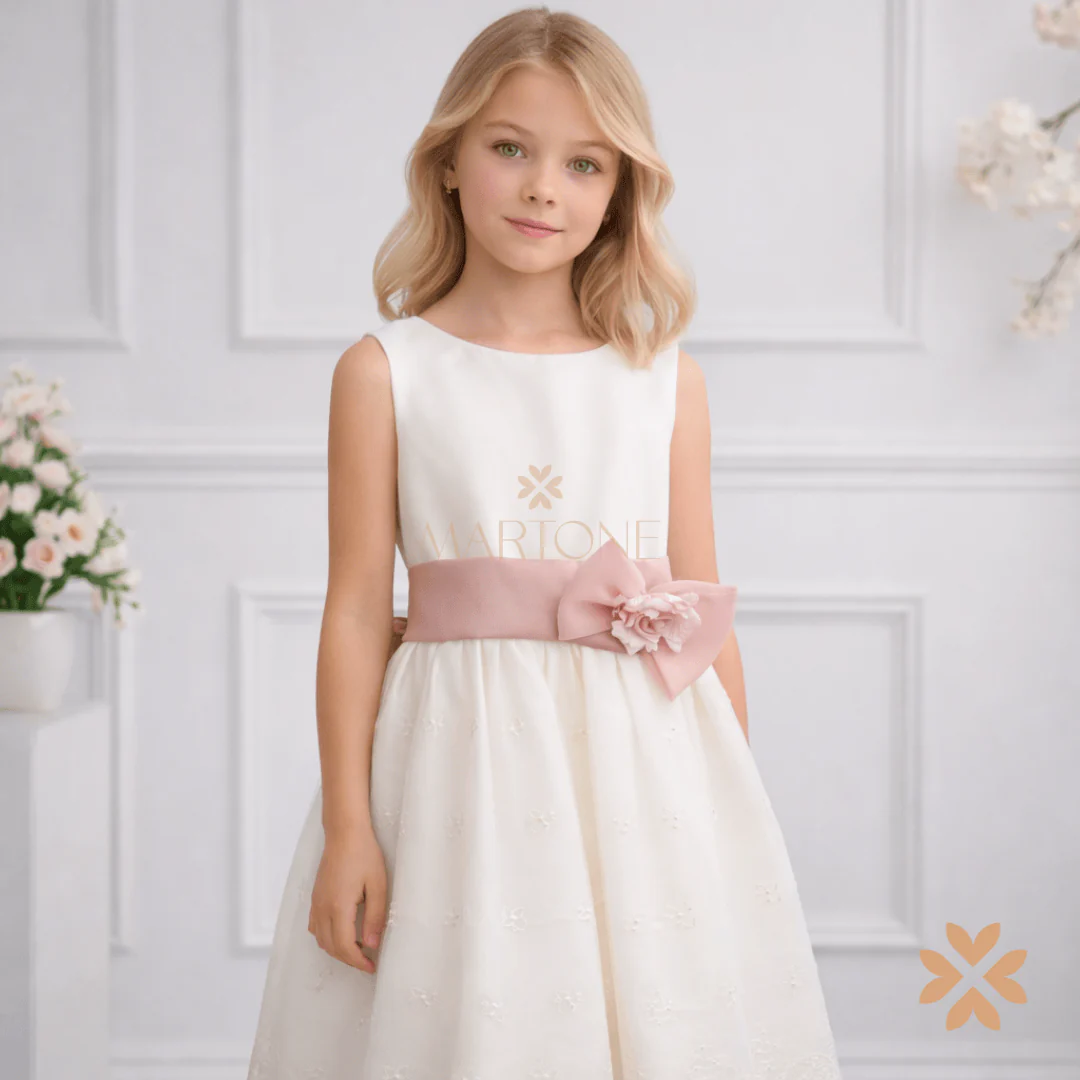 Abito da cerimonia per bambina realizzato con corpetto in tessuto satinato dalla linea pulita e scollo tondo. Il punto vita è valorizzato da una fascia in tonalità rosa cipria impreziosita da un fiocco strutturato con applicazione floreale. Gonna ampia con delicati ricami floreali tono su tono e bordo finale rifinito in pizzo ricamato. Chiusura posteriore con zip invisibile. Ideale per comunioni, cerimonie ed eventi eleganti.