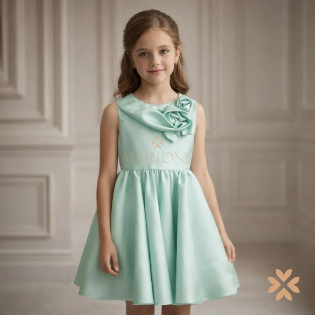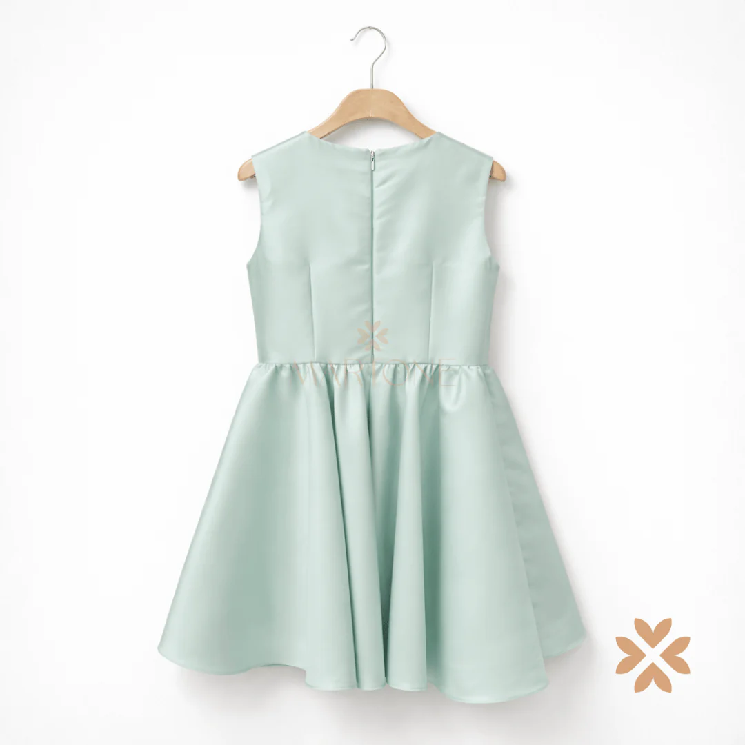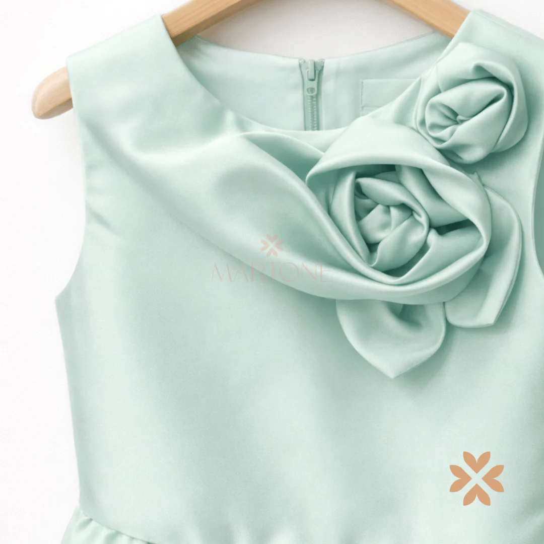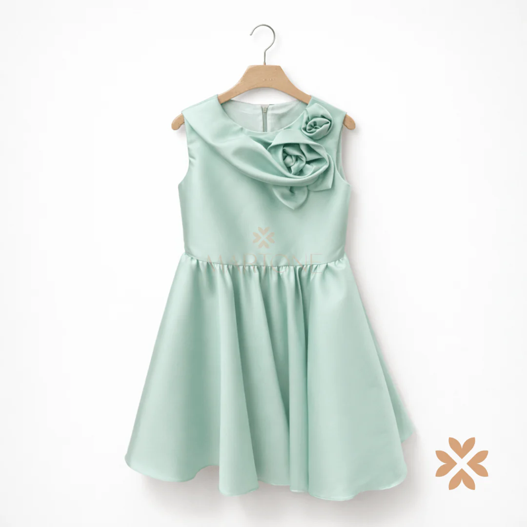 Un abito da cerimonia in raffinata tonalità verde salvia, essenziale nella linea ma ricercato nei dettagli. Il corpino pulito è valorizzato da un elegante drappeggio sullo scollo, che culmina in una scenografica applicazione floreale tono su tono, dal forte impatto estetico.
