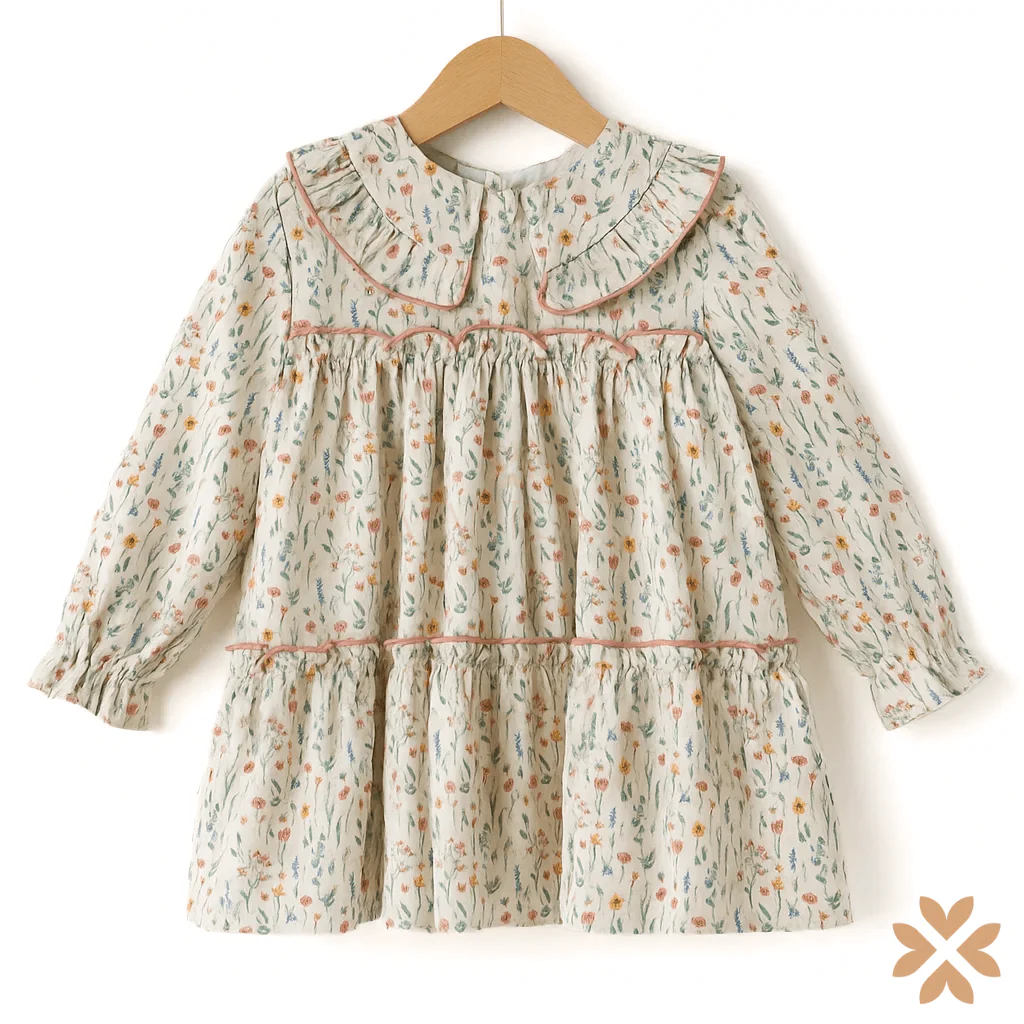 Abito per bambina in cotone stampato a fantasia floreale, con colletto tondo arricciato, maniche lunghe con polsino elasticizzato e inserti con passamaneria rosa a contrasto. Apertura posteriore con zip.