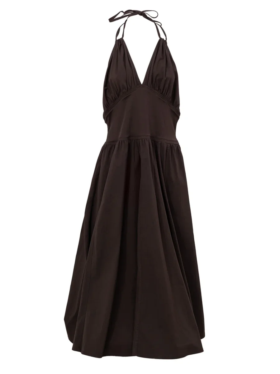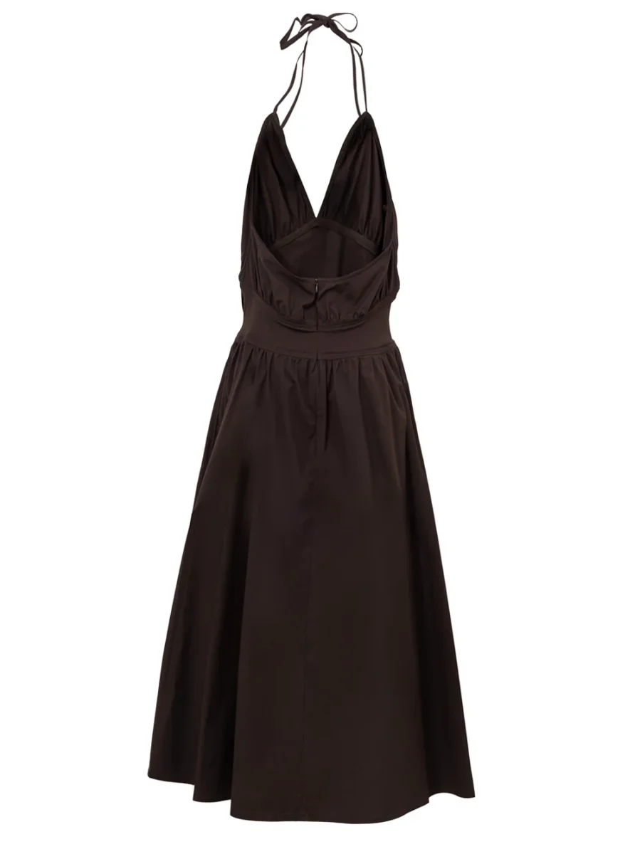 In cotone marrone, top con incrocio, fascia in vita, parte gonna molto ampia, spacco laterale. Sul retro schiena scoperta, chiusura con zip.