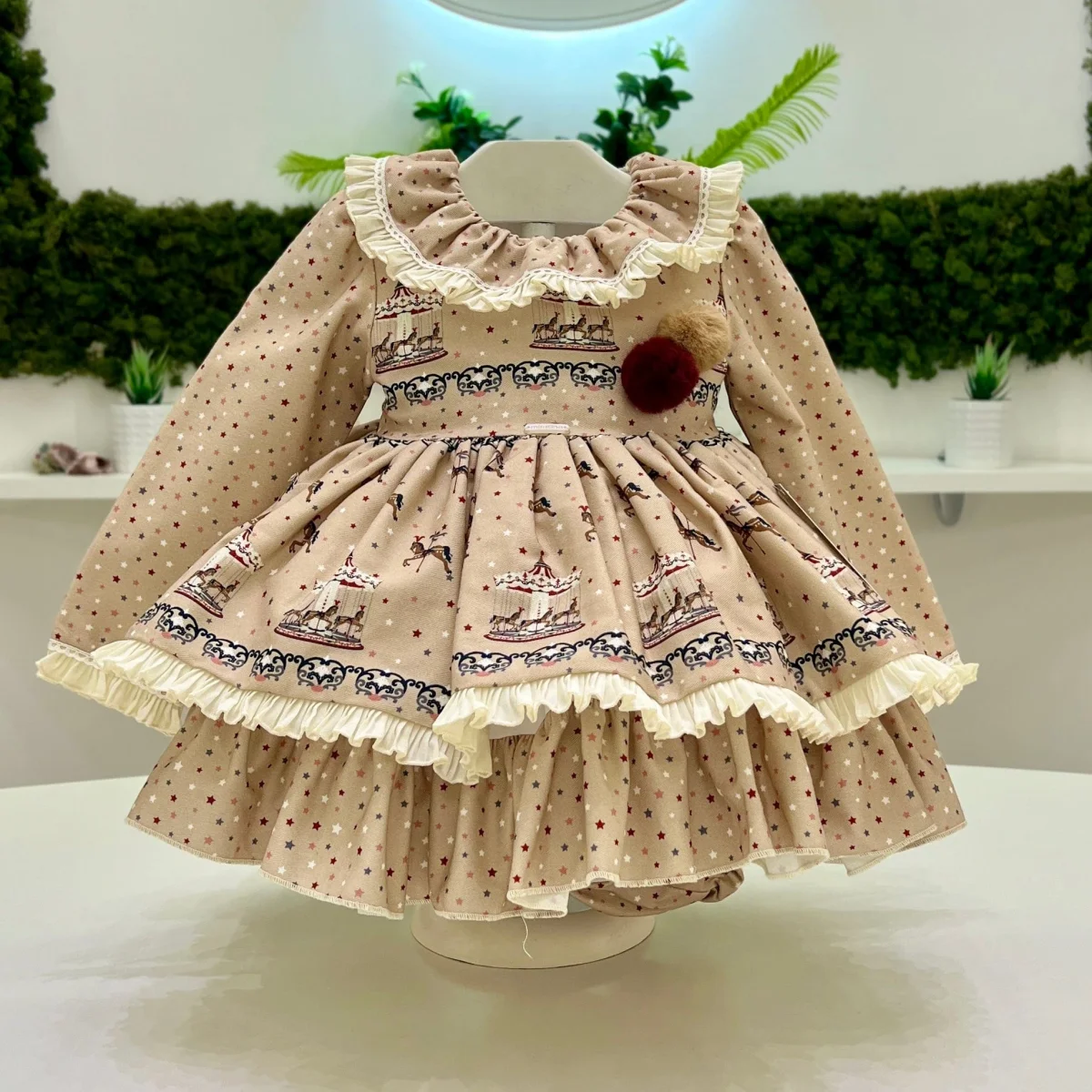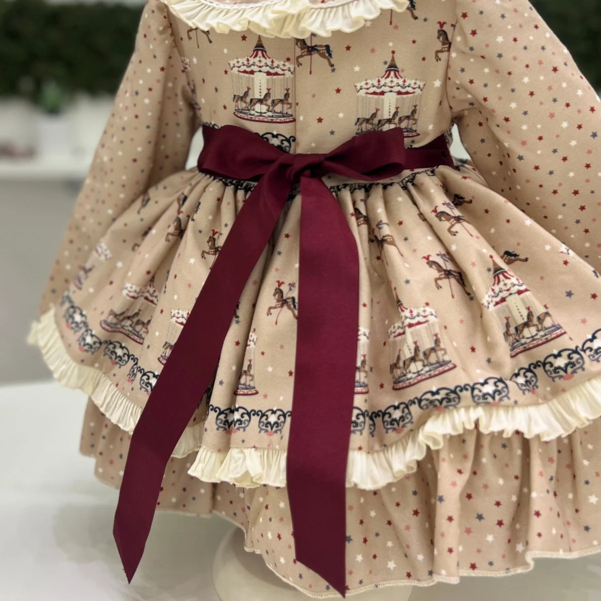 Abito in cotone a balze, collo con volant, pompon e cinturino nastrino fiocco. Stampa con carosello e stelline.