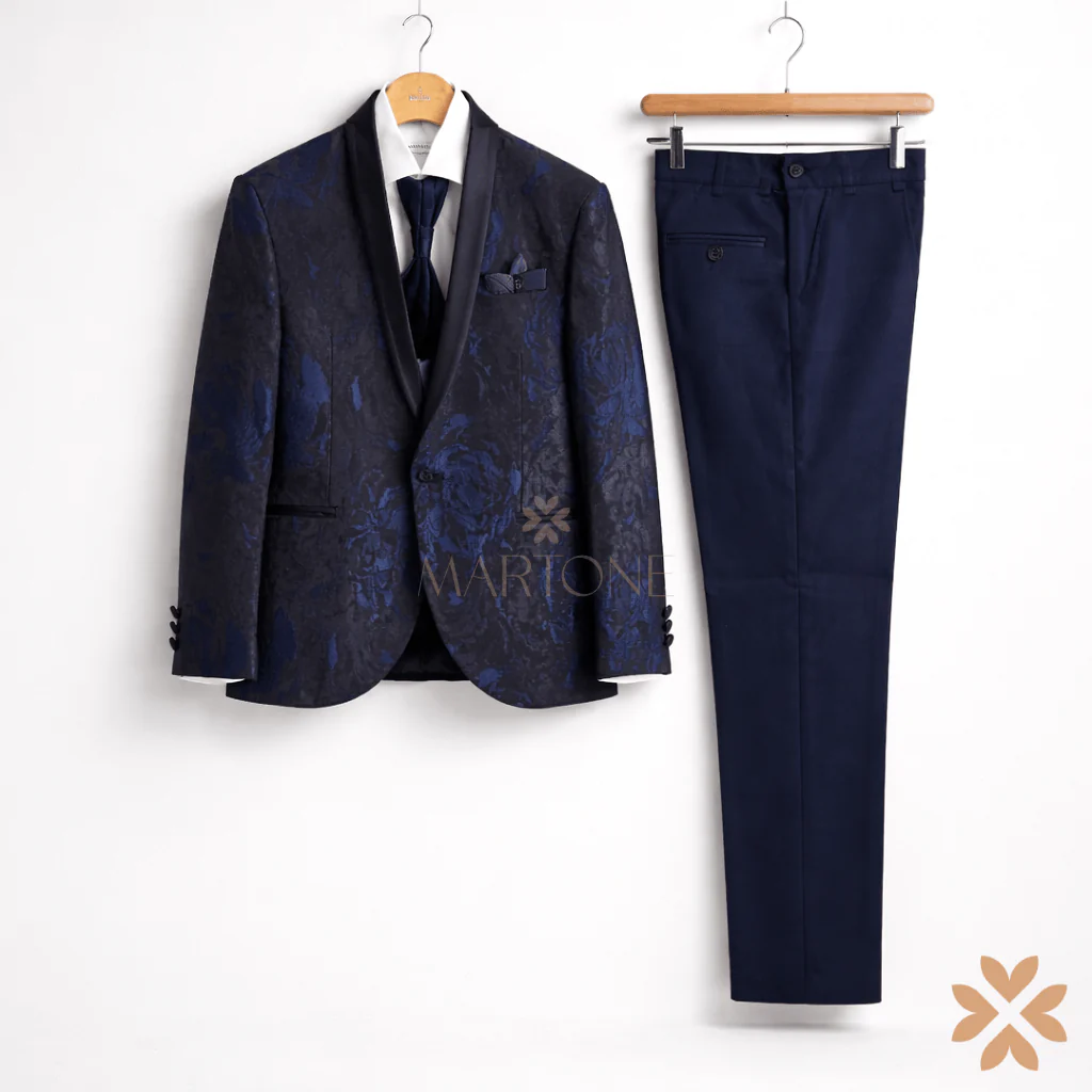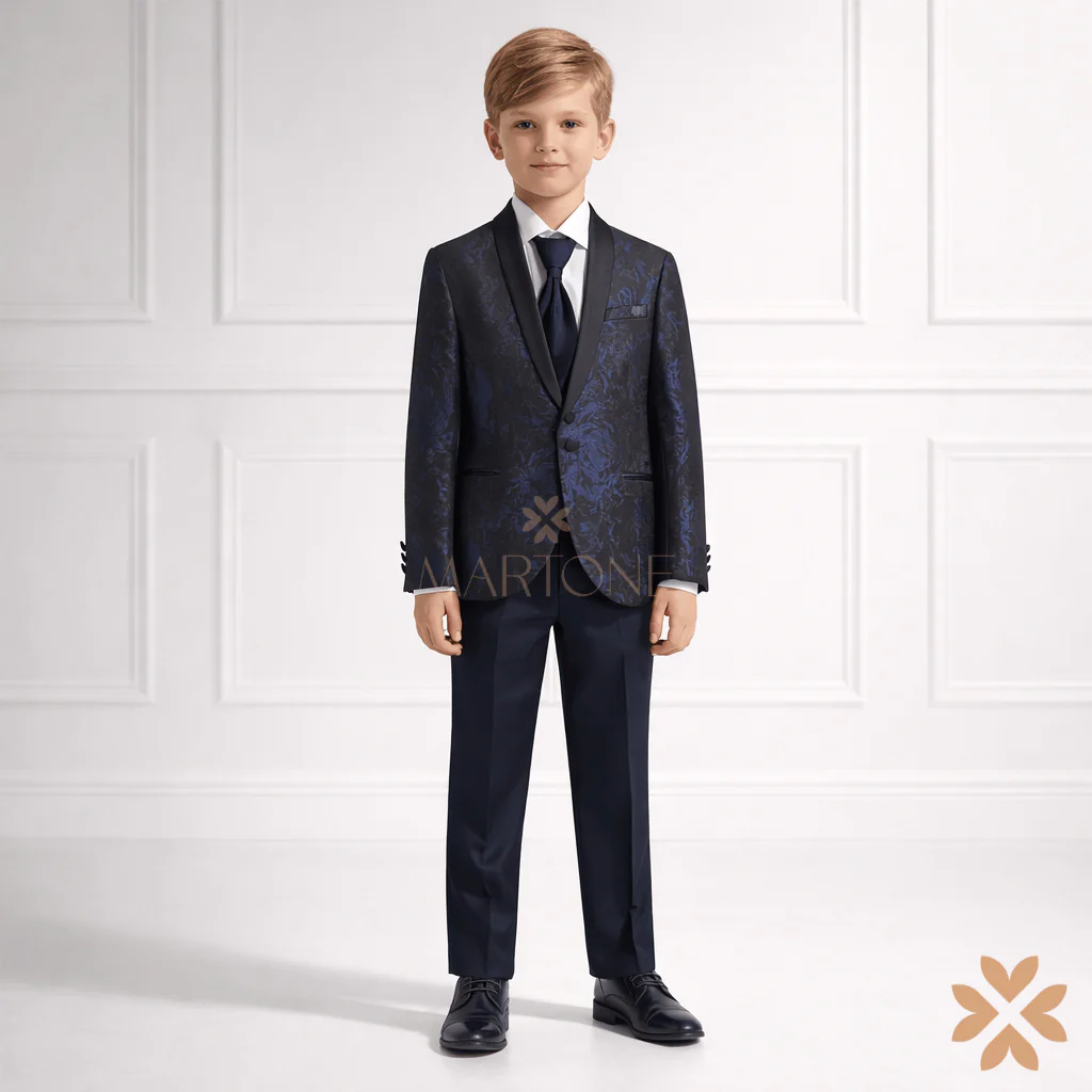 Abito da comunione per bambino caratterizzato da giacca blu notte con raffinata lavorazione jacquard tono su tono, impreziosita da revers in raso nero. Completo con gilet coordinato, camicia bianca e cravatta, per un insieme armonioso e ricercato. Pantalone classico blu dalla linea pulita, studiato per garantire una vestibilità impeccabile. Un completo di grande impatto, ideale per una cerimonia esclusiva e per chi cerca un’eleganza distintiva.