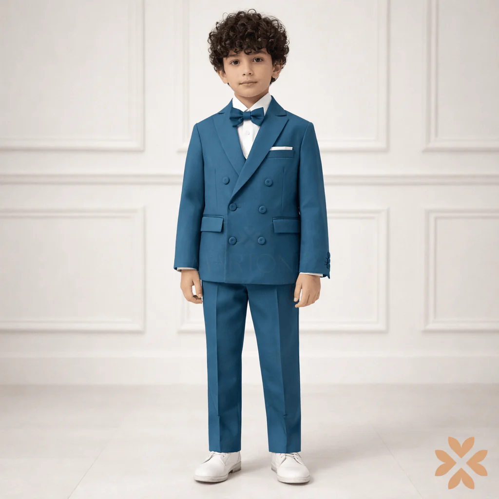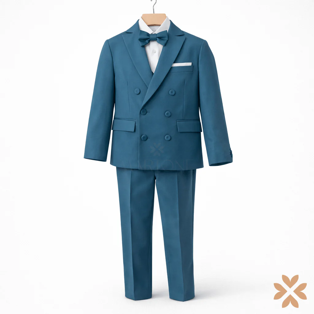 Completo cerimonia bambino composto da giacca doppiopetto color ottanio con rever classico, tasche con pattina e bottoni rivestiti tono su tono. Camicia bianca abbinata a papillon coordinato e pochette nel taschino. Pantalone nello stesso tessuto, dalla linea pulita e ben strutturata. Un completo dal carattere deciso e contemporaneo, ideale per cerimonie e occasioni formali, pensato per un’eleganza moderna e impeccabile.