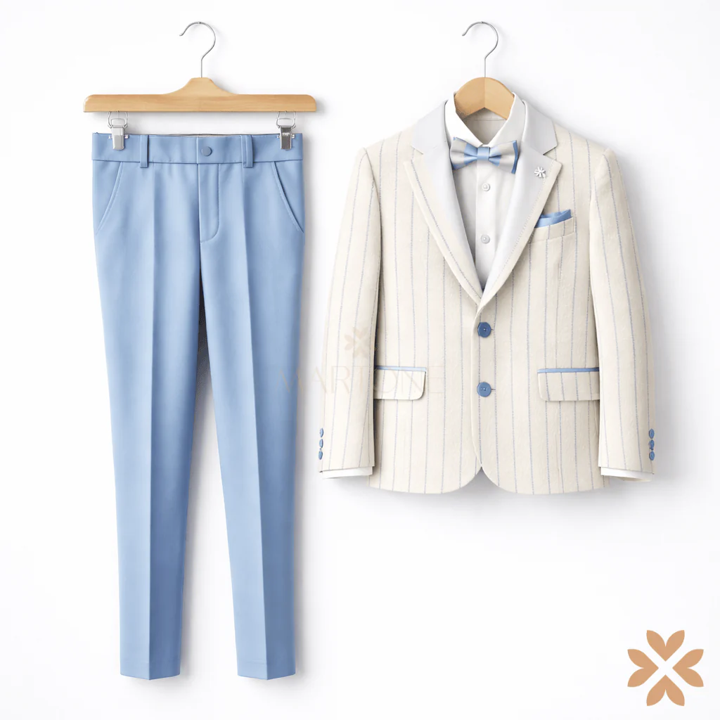 La giacca monopetto in tessuto chiaro a righe verticali sottili è valorizzata da dettagli azzurro polvere: profili sulle tasche, bottoni coordinati e papillon abbinato. Il rever classico e il taschino con pochette donano equilibrio e ricercatezza all’insieme.