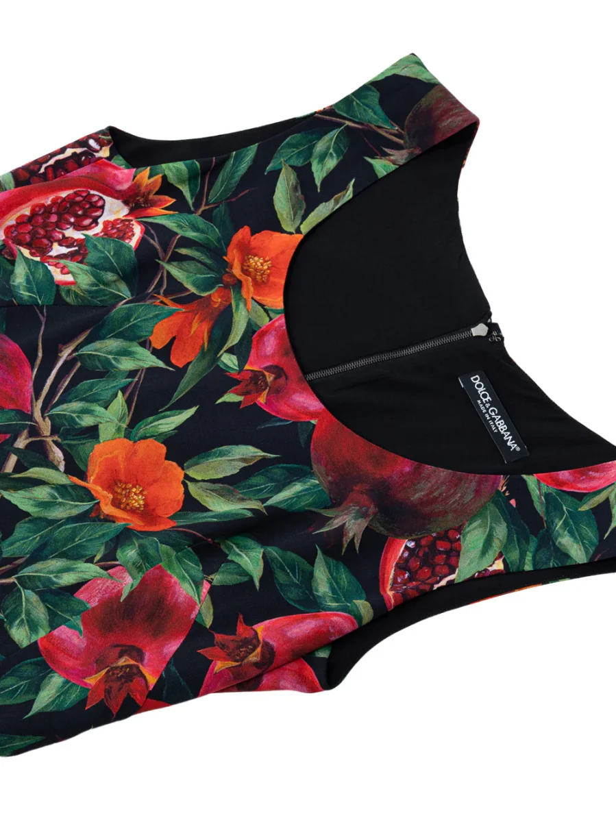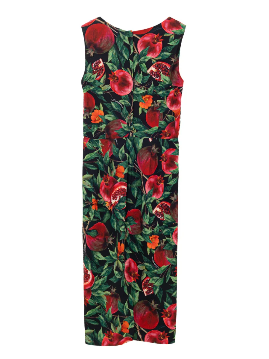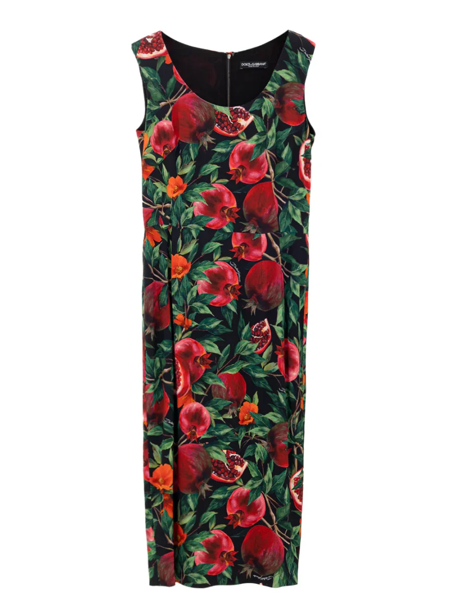 Abito con Stampa Melograni Dolce & Gabbana. Senza maniche, scollo tondo profondo, lungo con spacco sul retro, cucitura in vita. Stampa a contrasto rossa con logo.