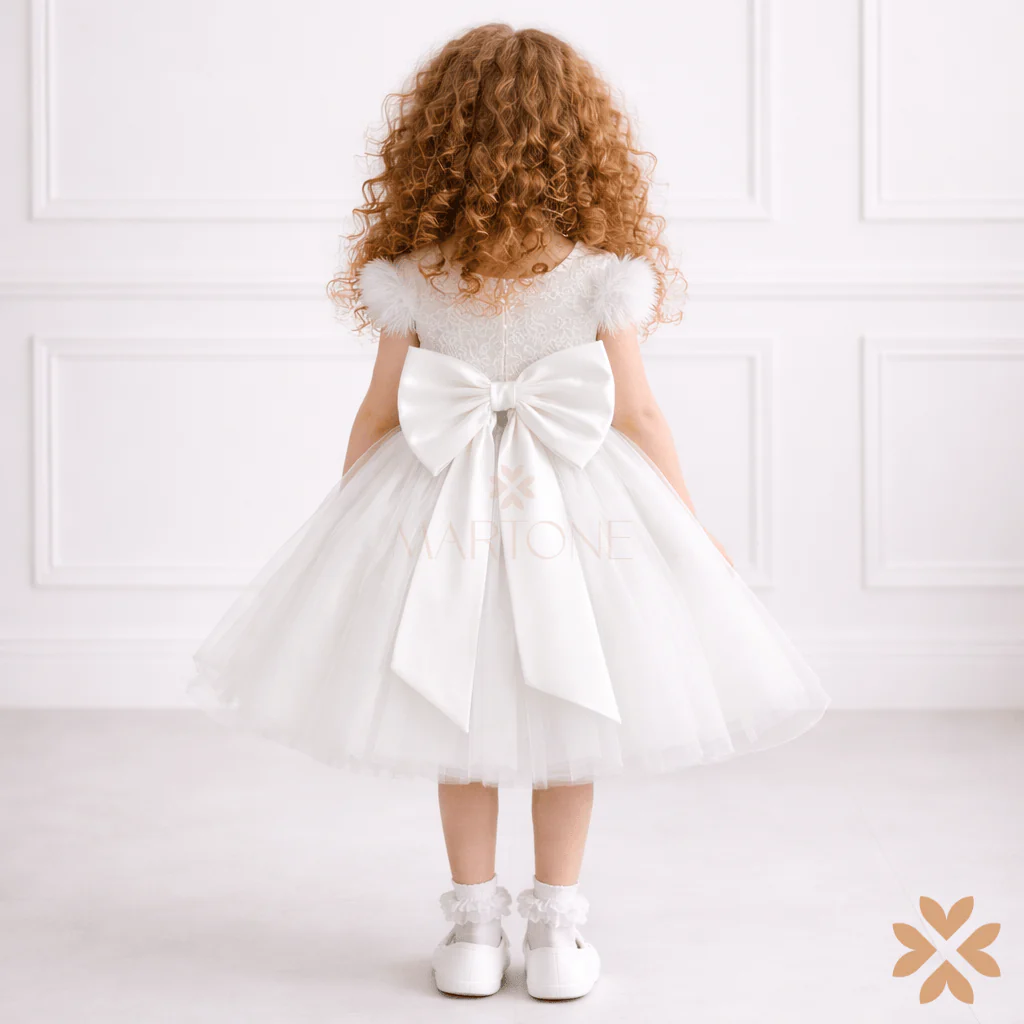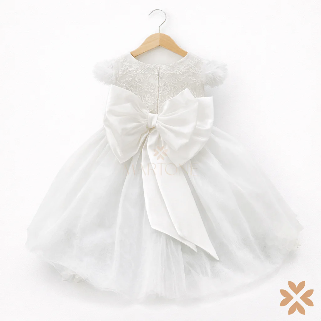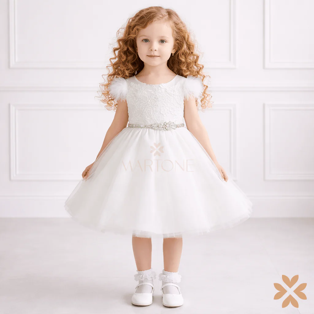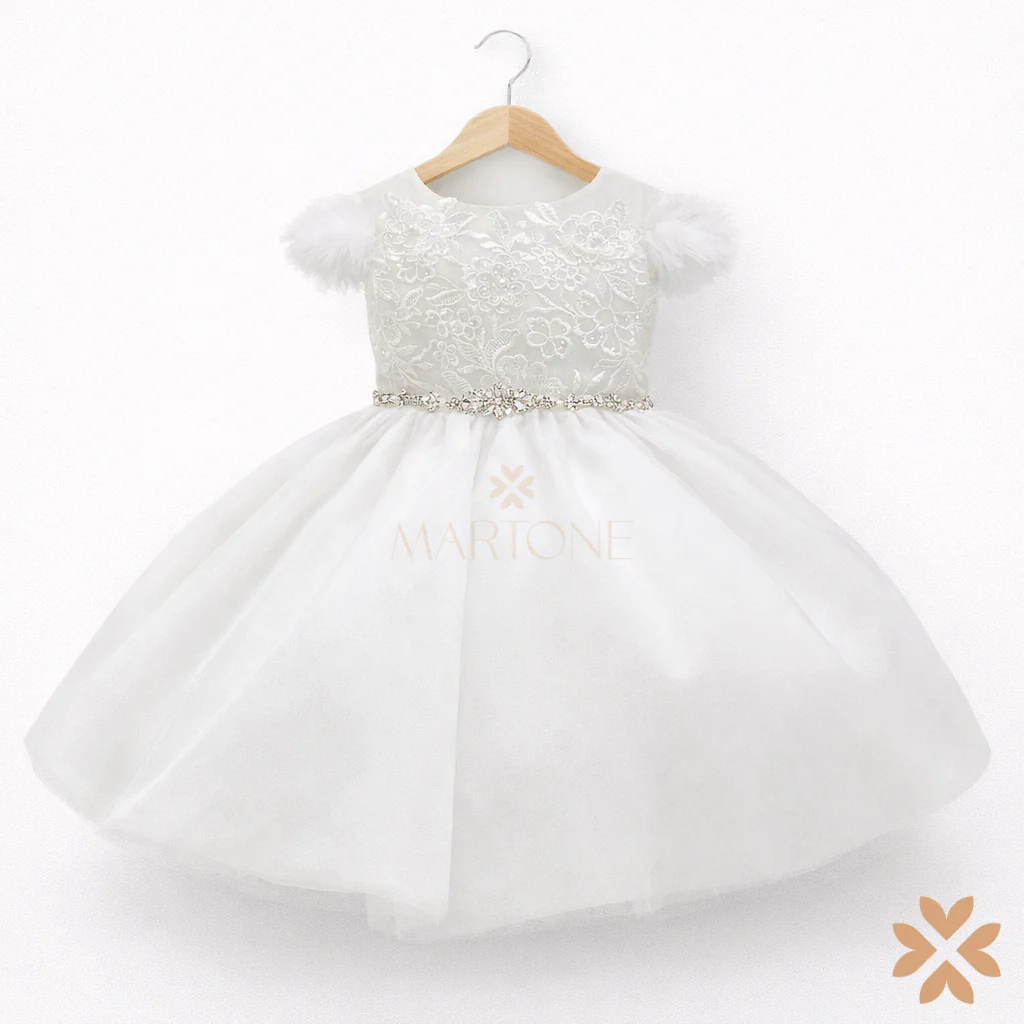 Un abito da fiaba che incanta con la sua raffinatezza. Il corpetto in pizzo ramage si unisce alla leggerezza del tulle, creando un effetto etereo e sofisticato. La manica in tulle dona un tocco di grazia, mentre la cintura gioiello illumina delicatamente il punto vita. Sul retro, un fiocco in mikado completa il look con eleganza regale. Perfetto per rendere indimenticabile ogni cerimonia.