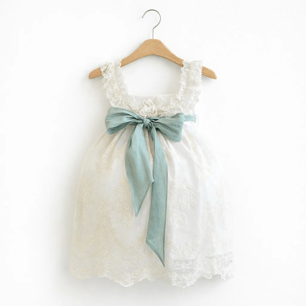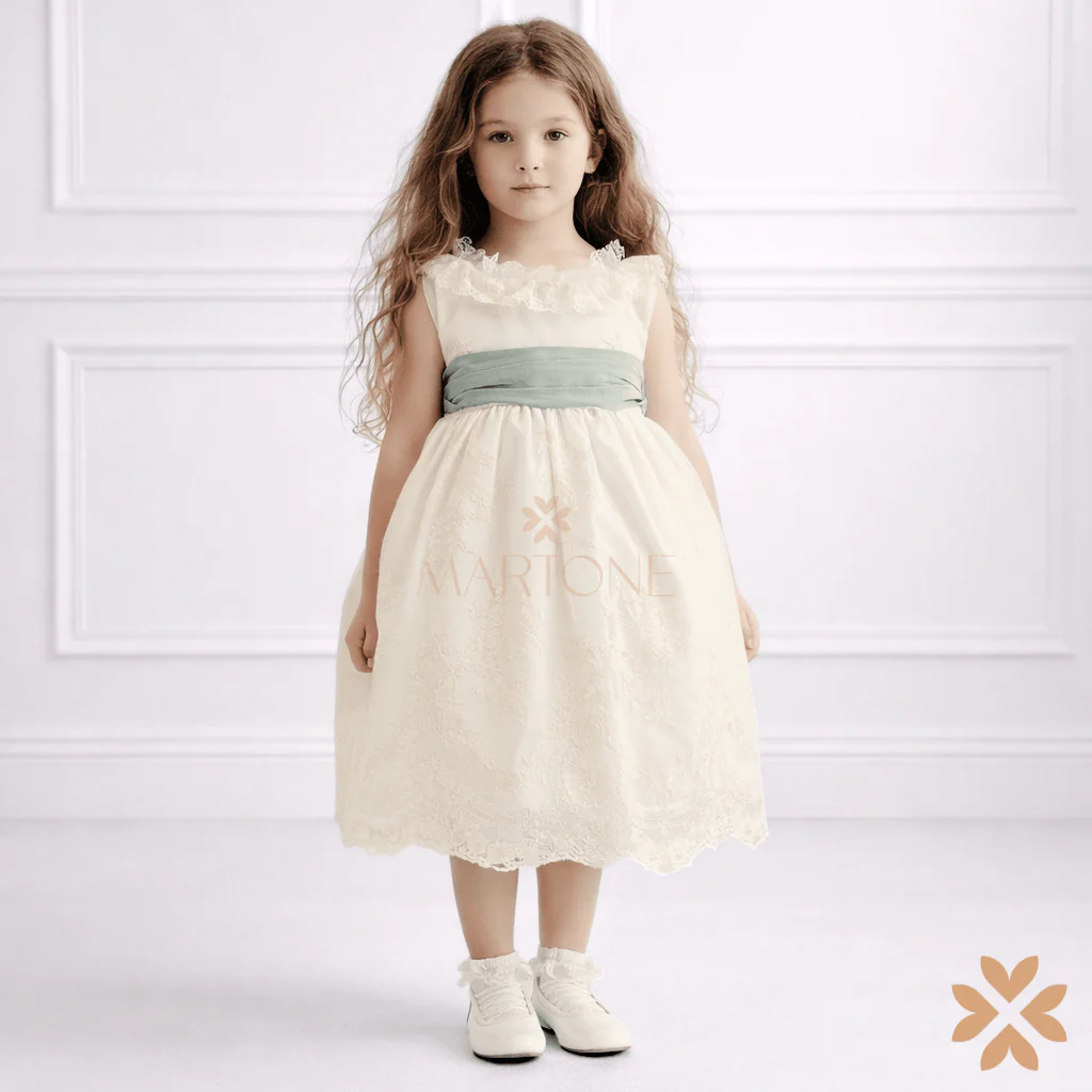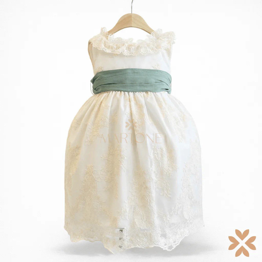 Abito da cerimonia in pizzo, con rouches sul collo e retro. Cintura in lino verde.