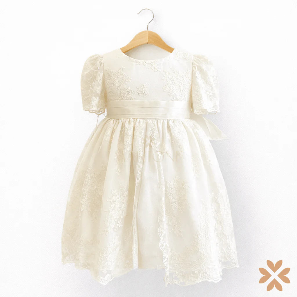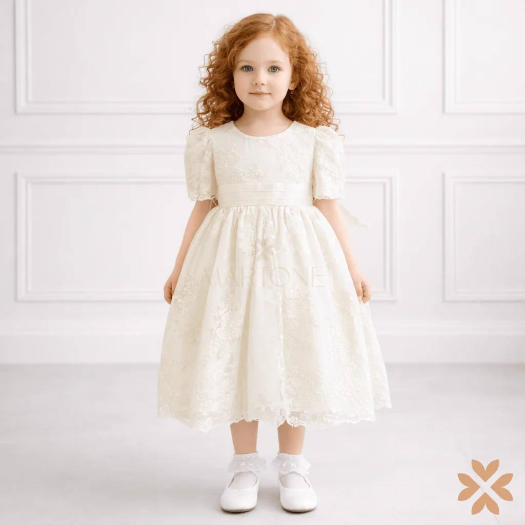 Abito damina in realizzato in pizzo con balze frontali, cintura in vita e scollo a diamante sul retro.