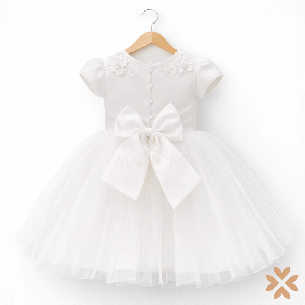 Abito domina con gonna in tulle, corpetto con manica corta ed applicazioni floreali in 3D