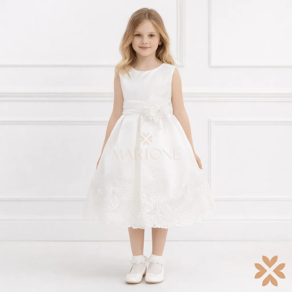 Abito da cerimonia in tulle bordato con merletto, manica a giro e cintura in tulle con spilla a fiore removibile.