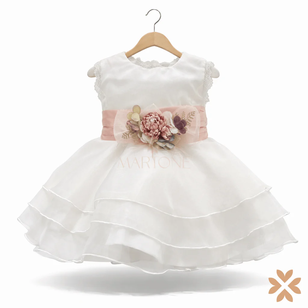 Abito in organza in seta con tripla balza a ruota, cintura in taffetà rosa con fiocco e dettaglio floreale.