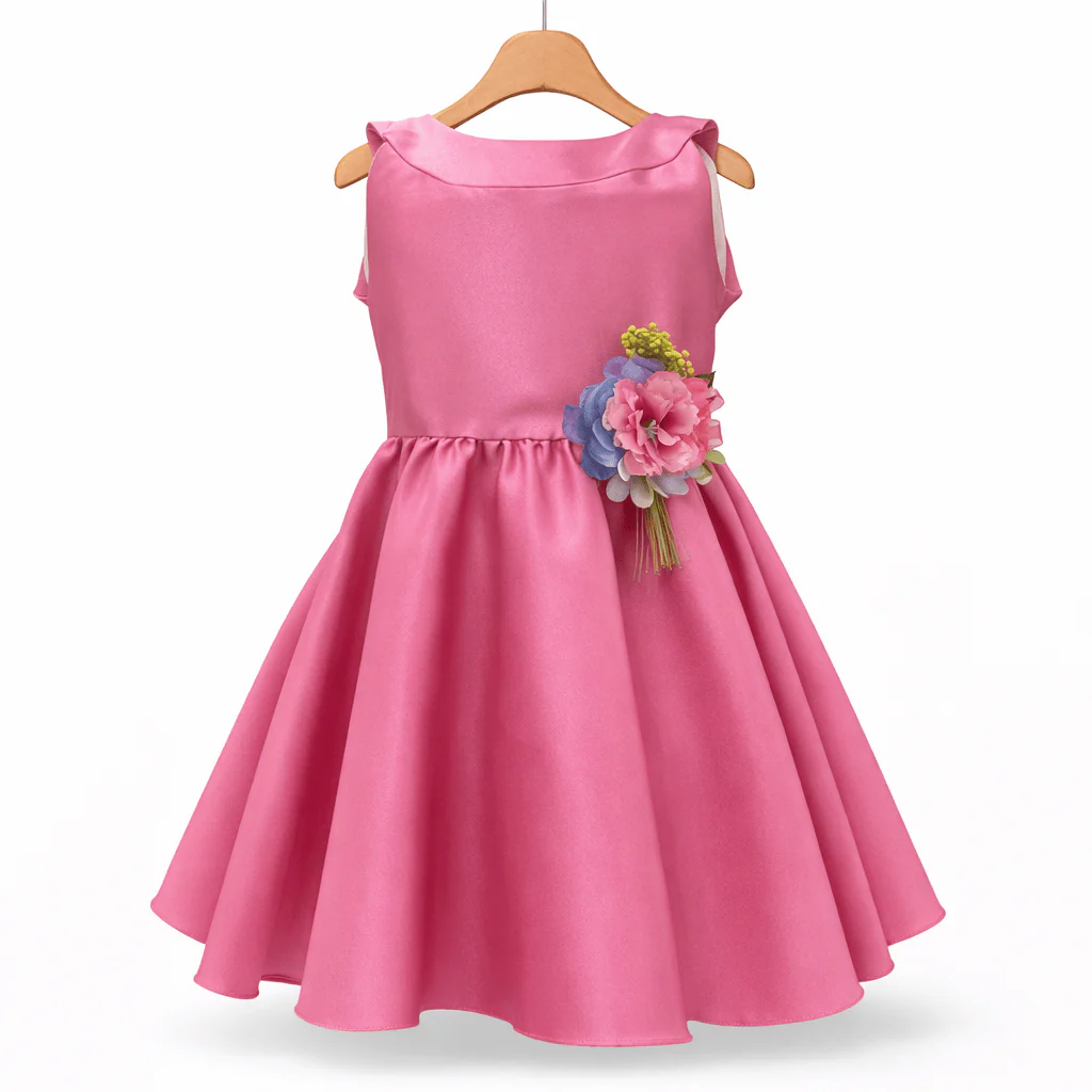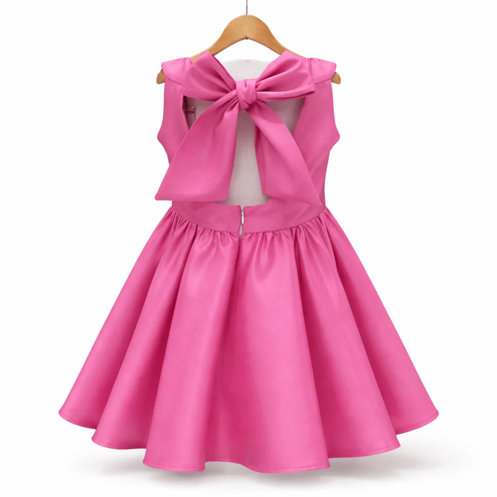 Abito da cerimonia in mikado, con dettaglio sul retro con abbottonatura a fiocco e scollo rotondo.
