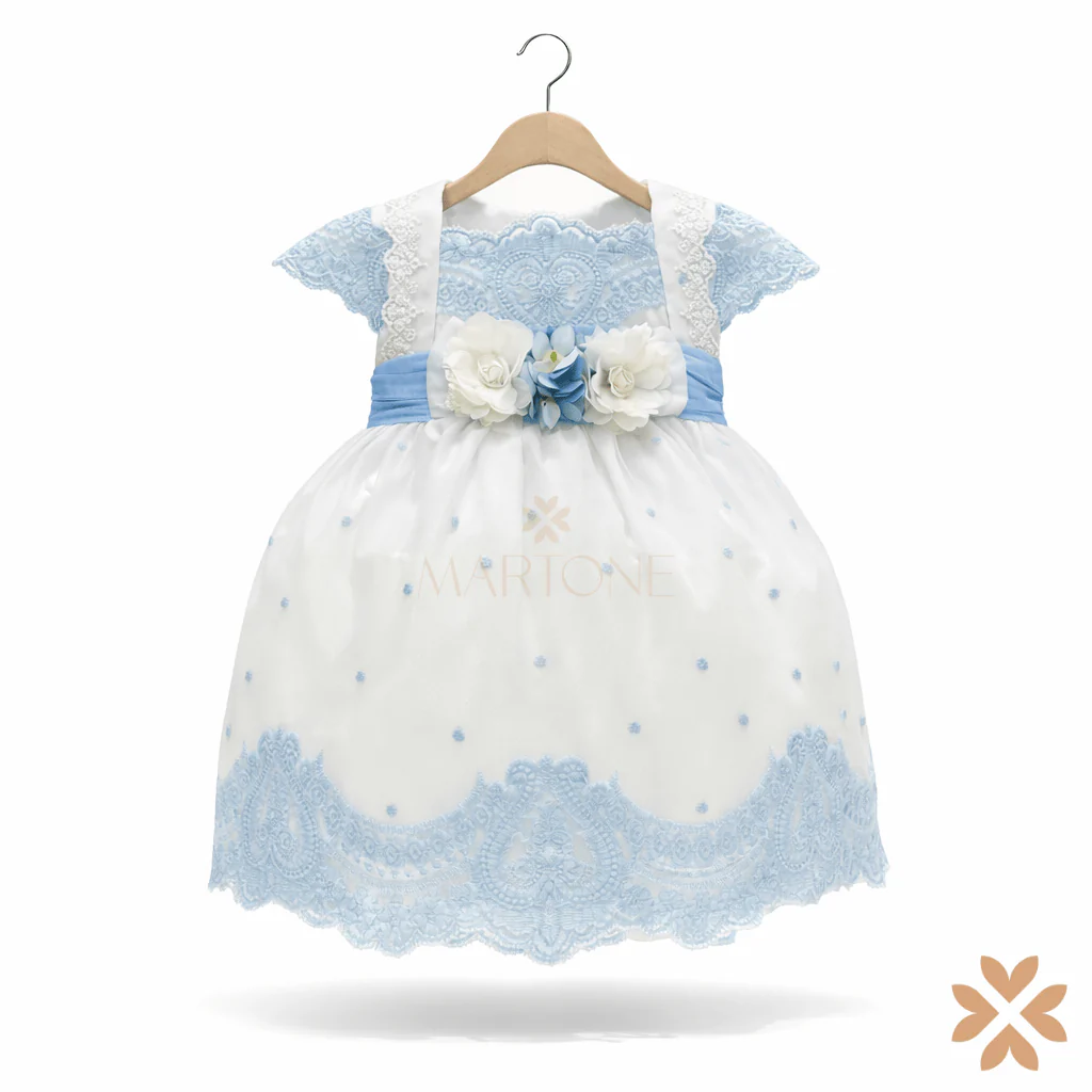 Abito bicolore in pizzo e tulle ricamato con scollatura sul retro ad oblò e fiocco in tulle.