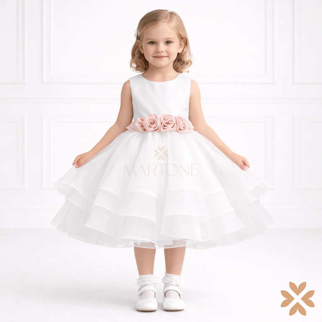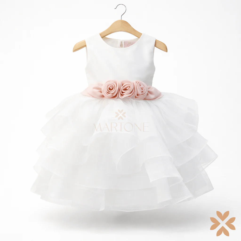 Abito da cerimonia con gonna ampia a balze in tulle bordato rigido, corpetto in mikado con manica a giro e spilla con dettaglio floreale.