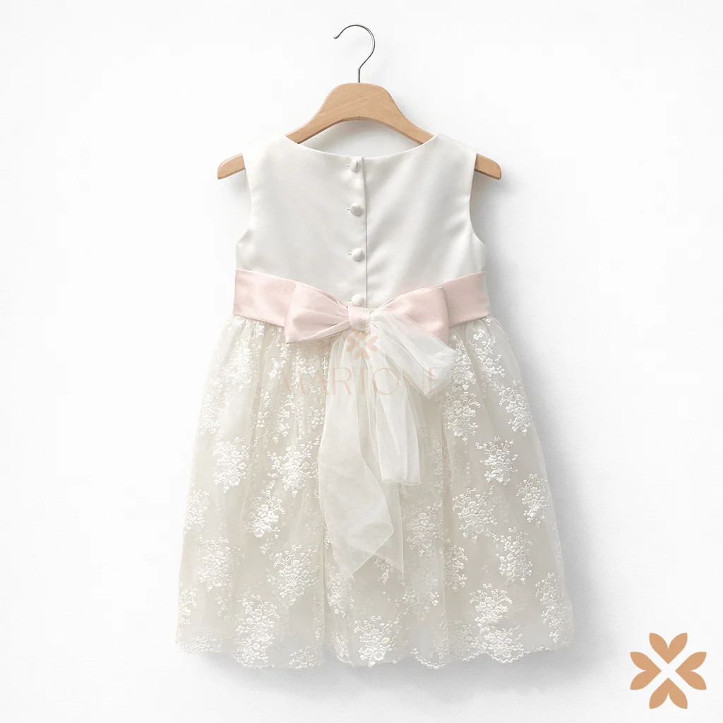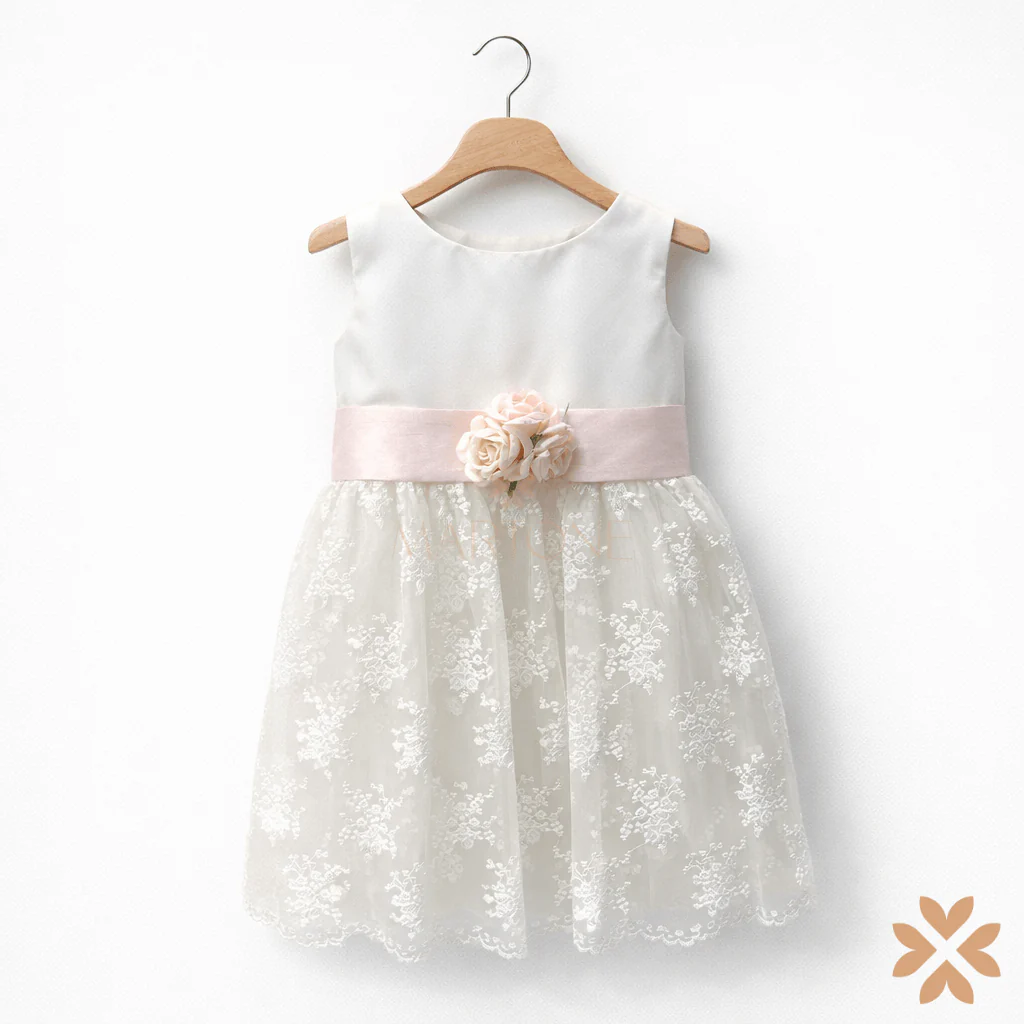 Abito da cerimonia per bambina in elegante, caratterizzato da un raffinato equilibrio tra semplicità e ricercatezza. Il corpino liscio senza maniche si unisce a una gonna in tulle ricamato con delicati motivi floreali, creando un effetto etereo e luminoso. La fascia rosa cipria in vita, impreziosita da un fiore centrale sul davanti, valorizza la linea con discreta eleganza; sul retro, un morbido fiocco in tulle completa il design con un tocco romantico. Un capo top quality, pensato per uno stile senza tempo e di grande raffinatezza.
