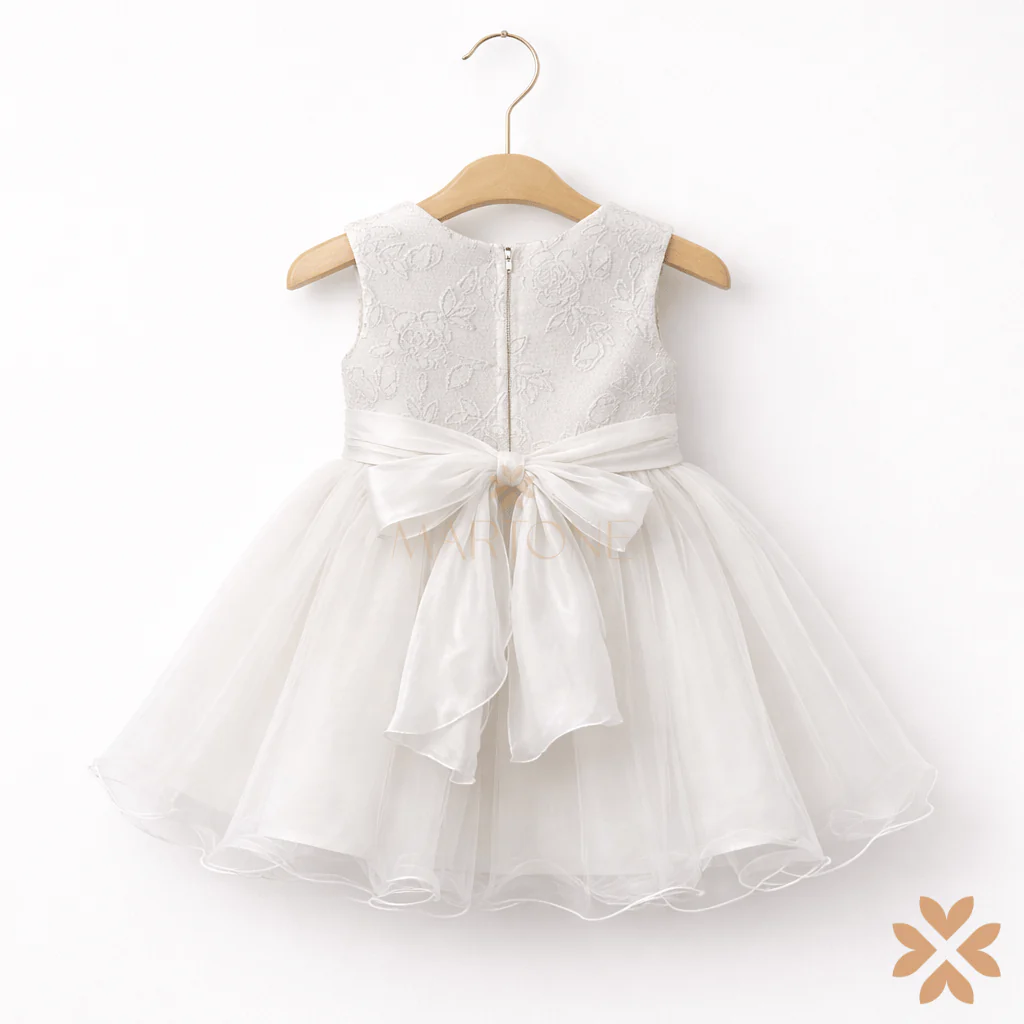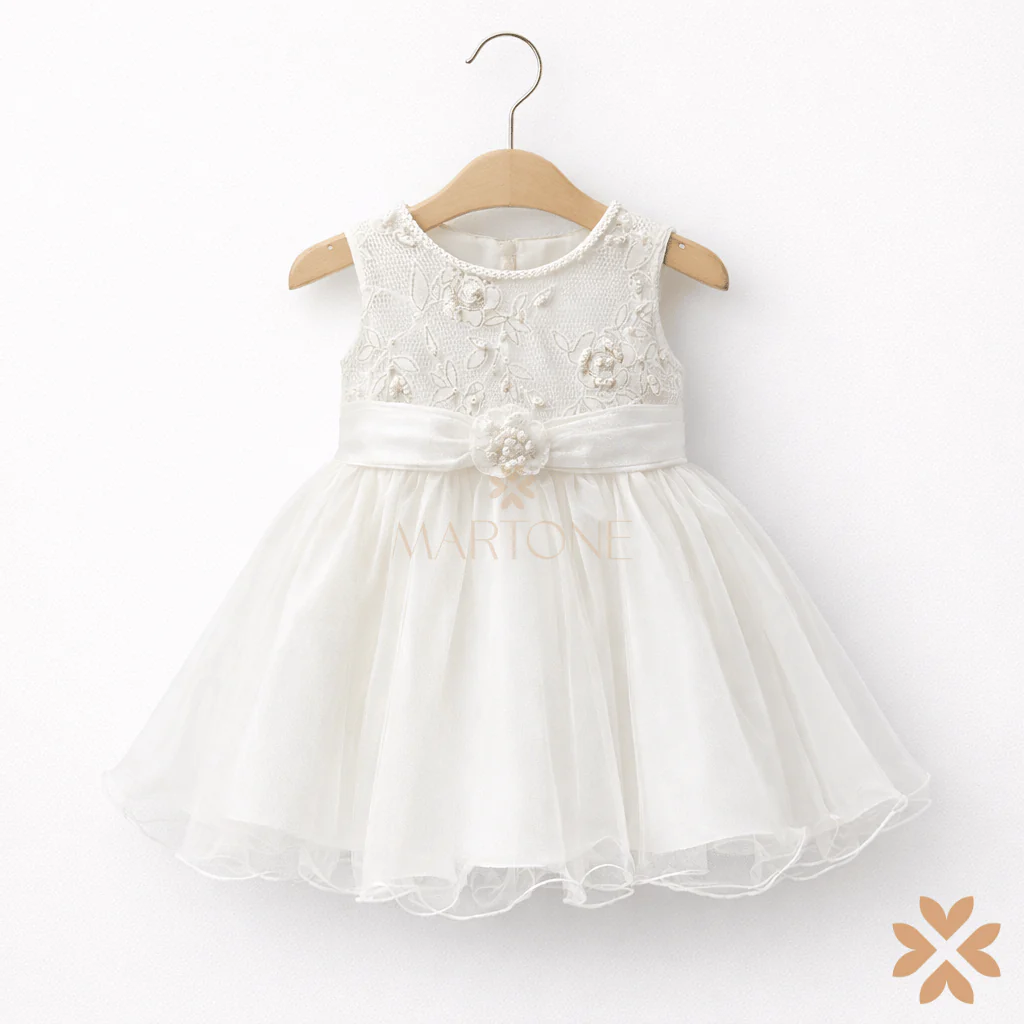 Abito da cerimonia con corpino ricamato e dettagli in perline, impreziosito da una fascia in organza con applicazione centrale gioiello. La gonna ampia in tulle dona volume e movimento, mantenendo una maglia dalla linea morbida ed equilibrata. Un capo di top quality, pensato per cerimonie raffinate e occasioni importanti.