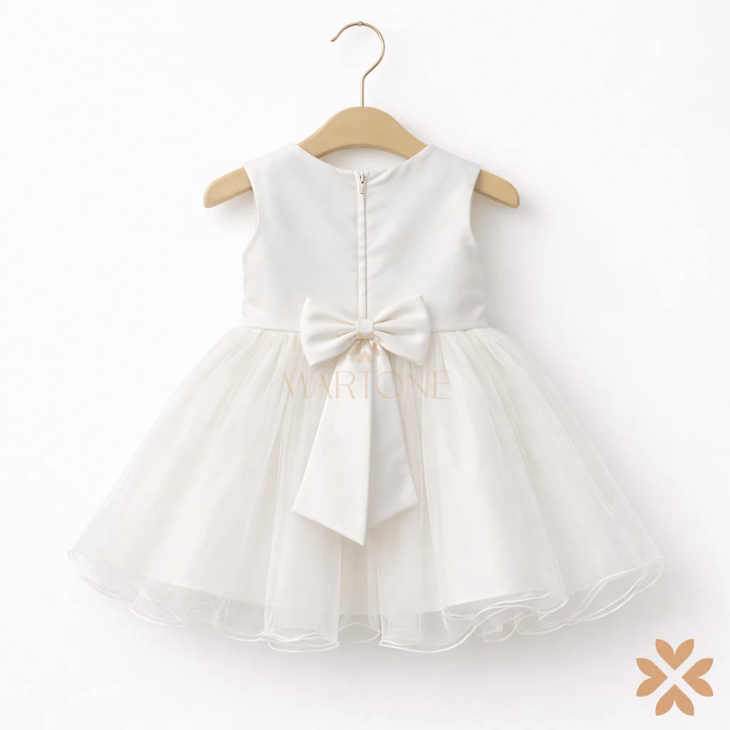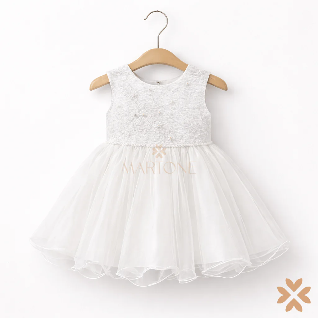 Abito da cerimonia in avorio con corpino lavorato a rilievo e delicati ricami floreali, arricchito da piccole applicazioni luminose. La vita è rifinita da un sottile profilo decorativo, mentre la gonna in tulle leggero crea una maglia dalla linea morbida e armoniosa. Un capo di top quality, elegante e senza tempo.