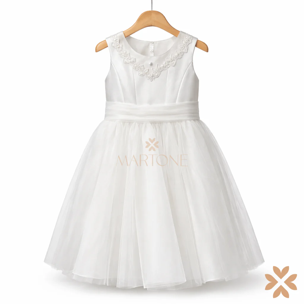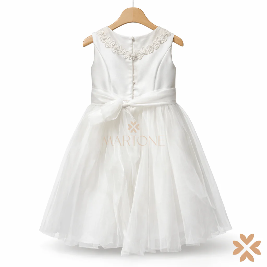 Abito dallo stile romantico classico, caratterizzato da un corpino strutturato con delicata applicazione floreale sullo scollo che incornicia la linea con eleganza. La vita è segnata da una fascia in tulle tono su tono, mentre la gonna ampia in tulle leggero crea volume e movimento senza appesantire. Il fiocco sul retro completa il design con discreta armonia. Uno stile luminoso, raffinato e senza tempo, pensato per un’eleganza delicata e ben bilanciata.