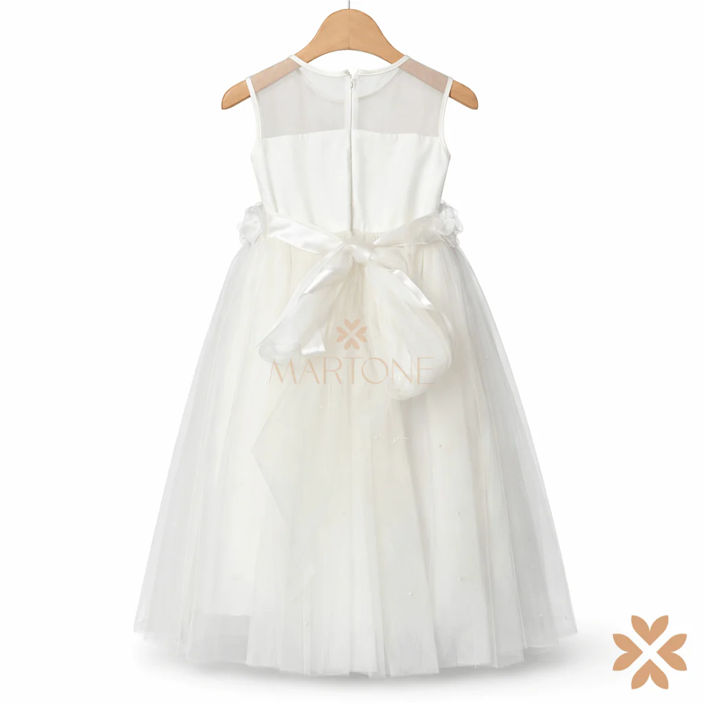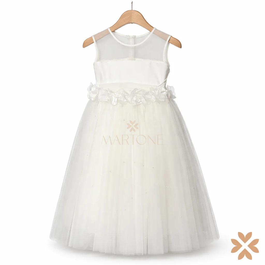 Abito dallo stile etereo e raffinato, caratterizzato da un corpino lineare con inserto in tulle trasparente che dona leggerezza e modernità. La vita è valorizzata da una delicata applicazione floreale tono su tono, mentre la gonna ampia in tulle, arricchita da micro punti luce, crea un effetto morbido e armonioso. Il fiocco sul retro completa il design con discreta eleganza. Uno stile romantico-contemporaneo, luminoso e pulito, pensato per un’eleganza delicata ma ben definita.