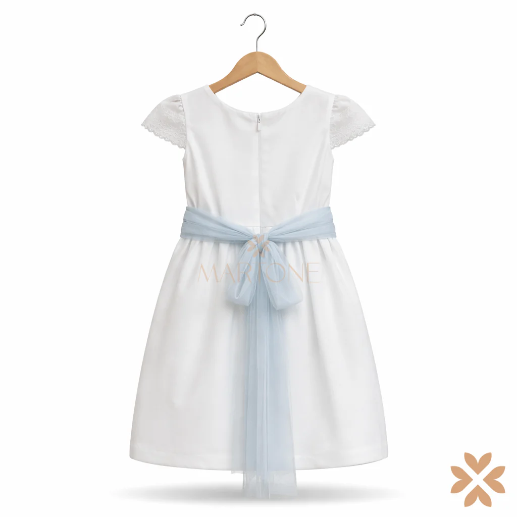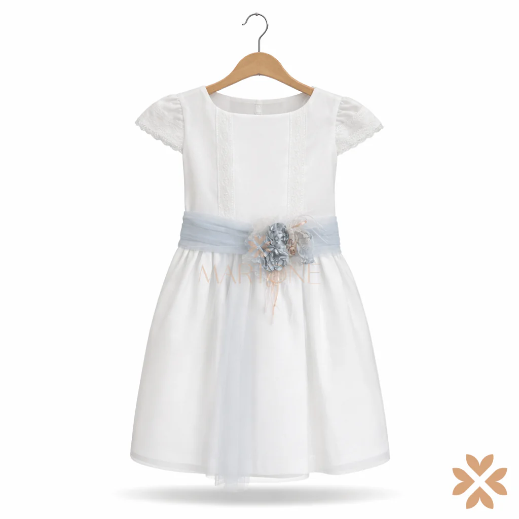 Abito dal gusto classico-romantico, caratterizzato da un corpino in tessuto strutturato con sottili inserti decorativi verticali e maniche corte rifinite in pizzo. La vita è definita da una fascia in tulle azzurro con applicazione floreale, che crea un delicato contrasto cromatico. La gonna in tulle leggero scende morbida, donando equilibrio e movimento all’insieme. Uno stile elegante, armonioso e senza tempo, pensato per chi ama linee tradizionali reinterpretate con discreta raffinatezza.