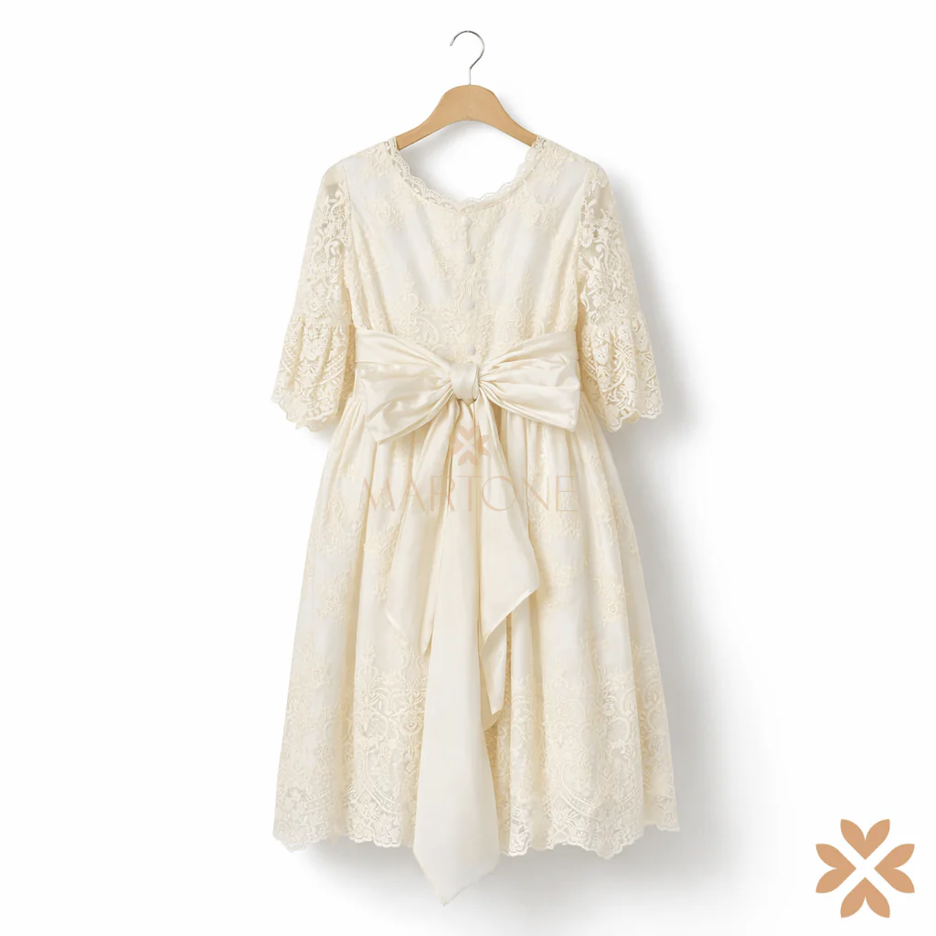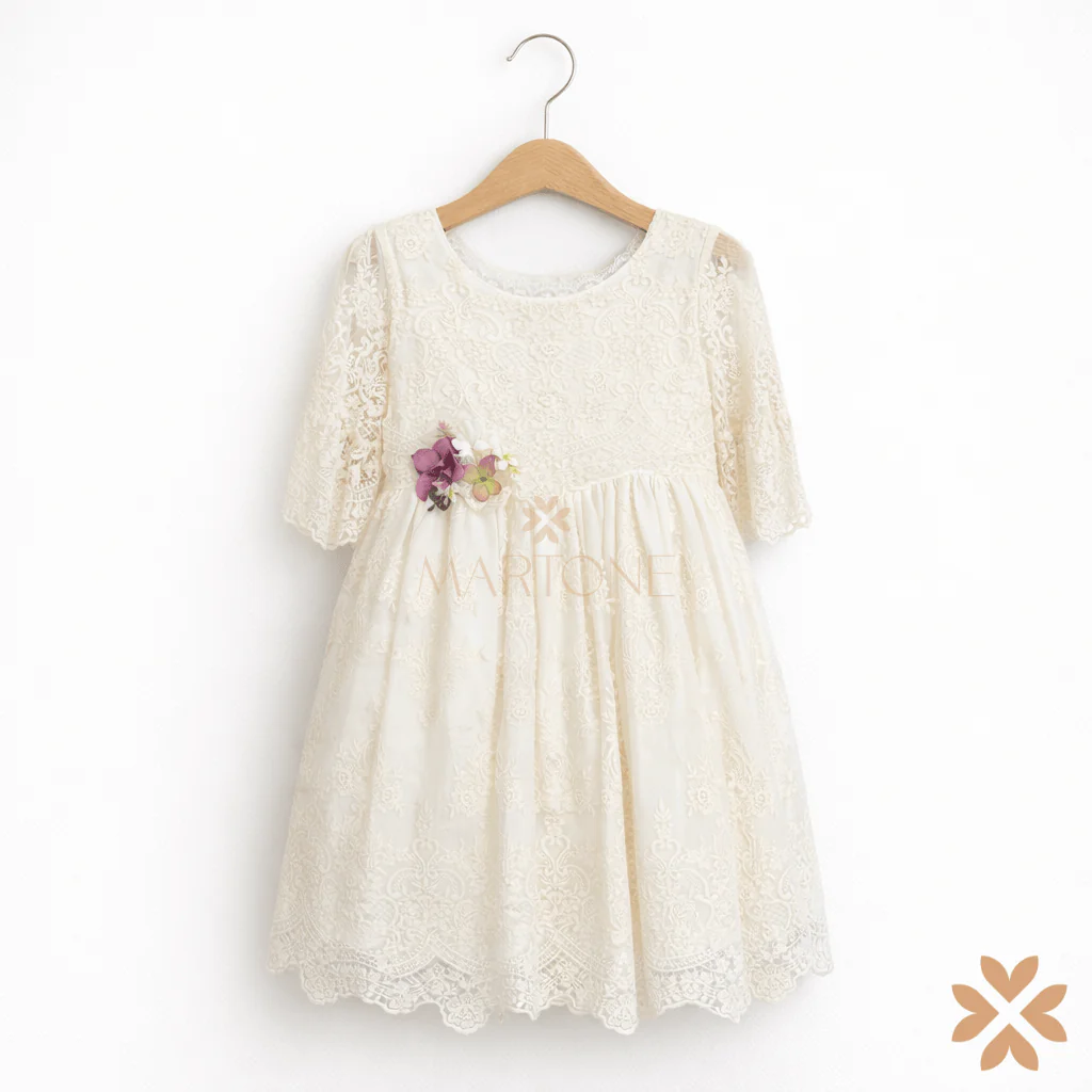 Abito per bambina realizzato interamente in pizzo con raffinato disegno floreale. Corpino con maniche tre quarti e scollo delicatamente rifinito. Vita definita da fascia in tessuto con fiocco laterale che valorizza la linea. Gonna ampia con fondo smerlato e chiusura sul retro. Stile romantico e senza tempo, pensato per chi ama un’eleganza classica e raffinata.