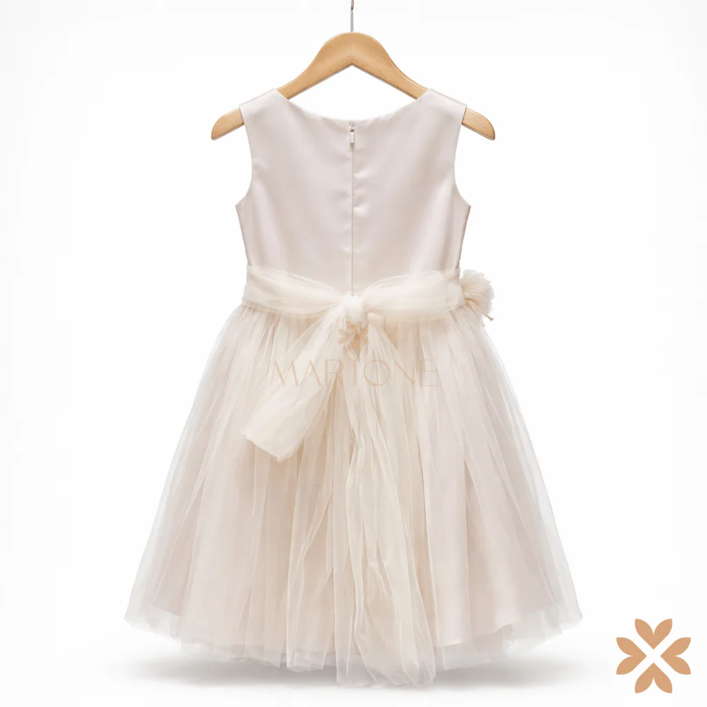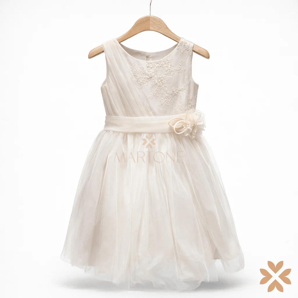 Abito da cerimonia per bambina con corpino in tessuto liscio e inserto in tulle ricamato sul davanti. Fascia in vita con applicazione floreale coordinata. Gonna in tulle leggero dalla linea morbida. Fiocco sul retro e chiusura con zip posteriore. Capo di top quality dal design pulito ed elegante.