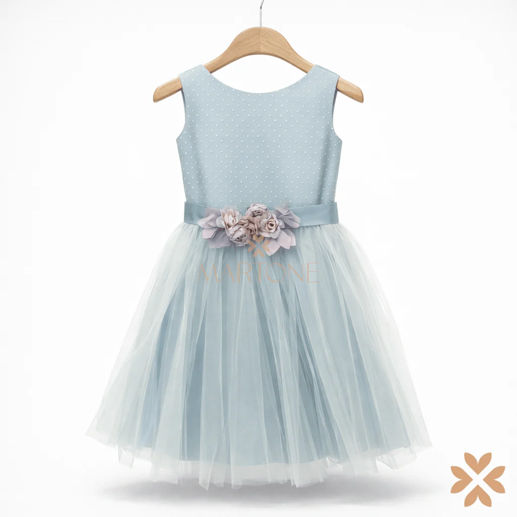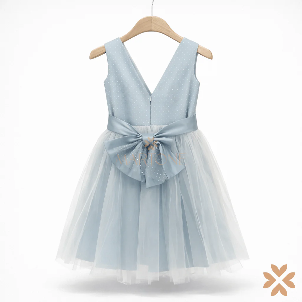 Abito da cerimonia per bambina con corpino in tessuto azzurro polvere a micro pois. Fascia in vita con applicazioni floreali coordinate. Gonna in tulle leggero dalla linea morbida che dona volume e movimento. Fiocco sul retro e chiusura con zip posteriore. Capo di top quality dal design delicato ed essenziale.