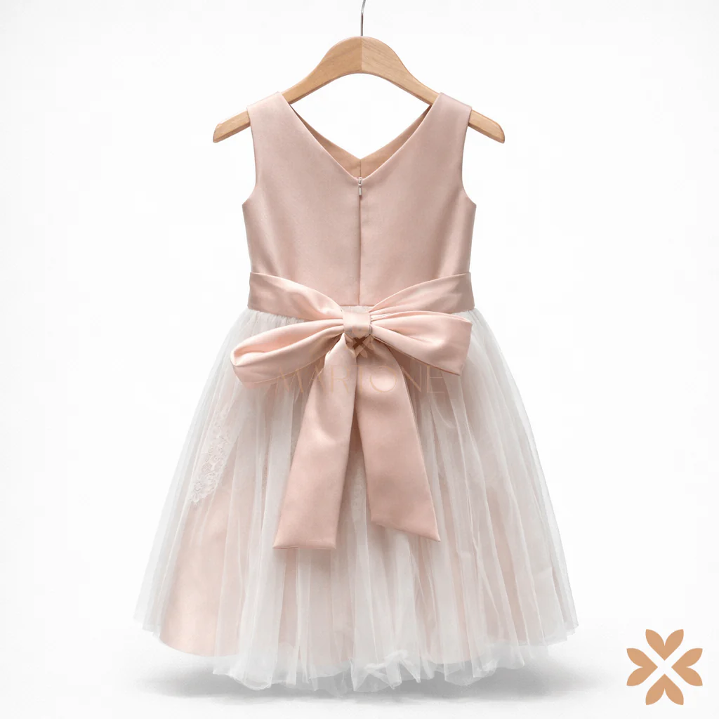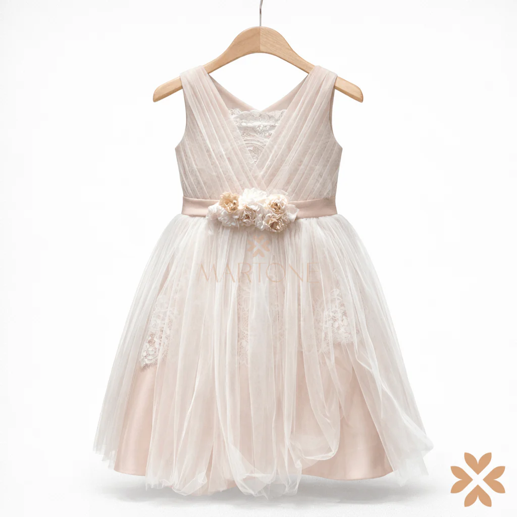 Abito da cerimonia per bambina con corpino incrociato in tulle plissé e inserto in pizzo. Fascia in vita in tessuto liscio con applicazioni floreali coordinate. Gonna in tulle leggero con sottogonna a contrasto e lunghezza asimmetrica. Fiocco sul retro e chiusura con zip posteriore. Capo di top quality dallo stile raffinato ed equilibrato.