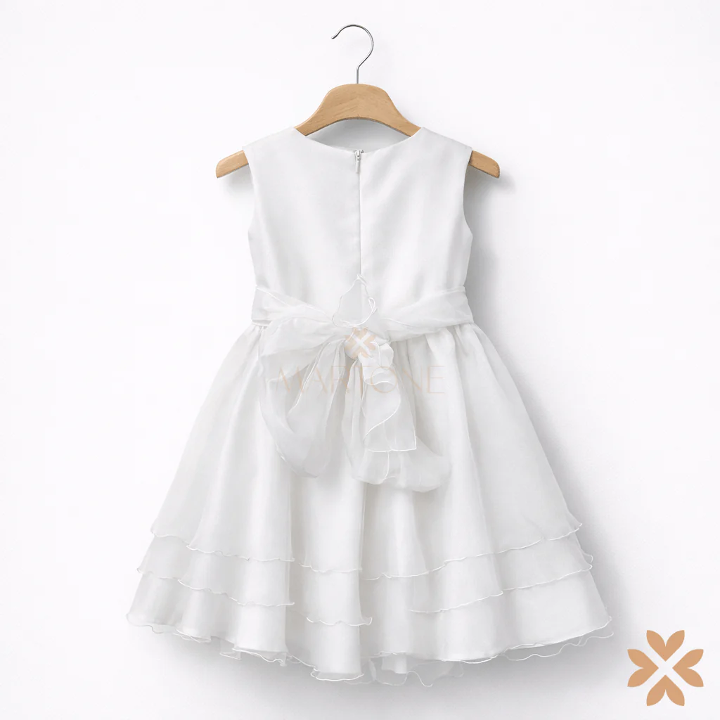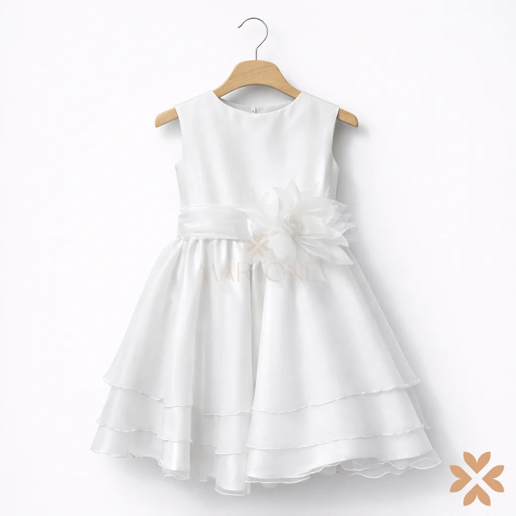 Abito da cerimonia per bambina realizzato in tessuto satinato con gonna in organza a balze leggere che donano movimento e volume al capo. Il corpino dalla linea pulita è valorizzato da una fascia in vita con applicazione floreale in tulle sul davanti e raffinato fiocco sul retro. Chiusura con zip posteriore.