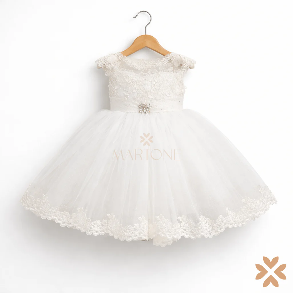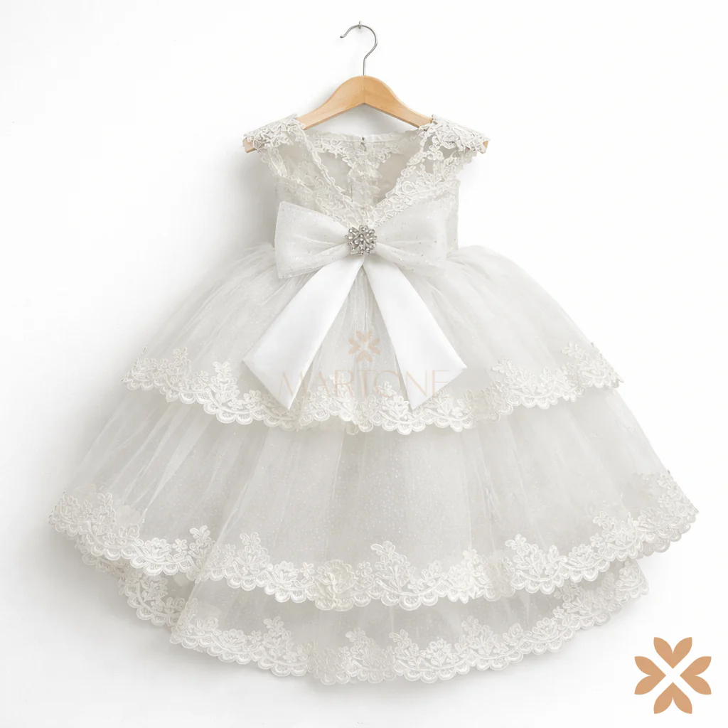 Un abito da battesimo che racchiude in sé l’eleganza regale e la raffinatezza di un sogno. La gonna ampia e vaporosa in tulle glitterato si apre in un tripudio di luce, bordata in pizzo per un effetto davvero incantevole. Il corpino con scollo a cuore e una minuziosa lavorazione in pizzo dona al look una classe senza pari. La cintura in vita, arricchita da un dettaglio gioiello, accentua la bellezza di questa piccola principessa. Ma è la coda a lasciare senza parole: una tripla balza bordata in pizzo, impreziosita da un fiocco rigido con strass, che sfocia in un movimento regale, mentre lo scollo a V sul retro aggiunge un tocco di misteriosa eleganza.