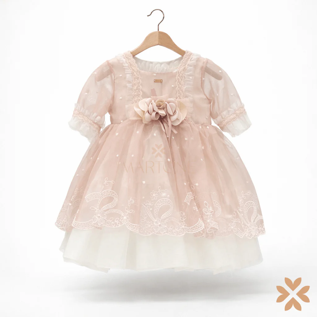 Abito elegante in tulle plumetis ricamato, con doppia balza in tessuto, corpetto ricamato con pizzo e manica tre quarti. Dettaglio floreale in vita.