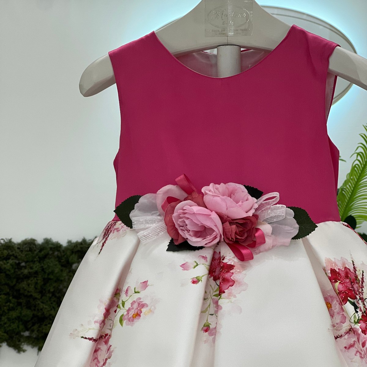 Abito elegante in mikado, gonna con stampa floreale e dettaglio in vita.