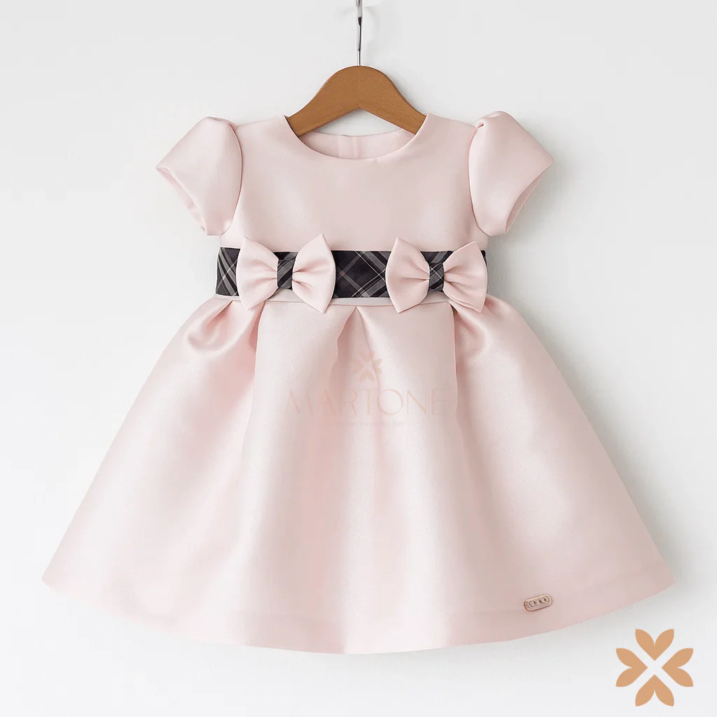 Abito elegante per in mikado rosa, con corpino strutturato e gonna ampia a pieghe dall’allure sofisticata. Le maniche corte donano un’eleganza intramontabile, mentre la cintura in tessuto tartan con doppi fiocchi frontali aggiunge un tocco distintivo e ricercato. Un capo perfetto per cerimonie e occasioni speciali.