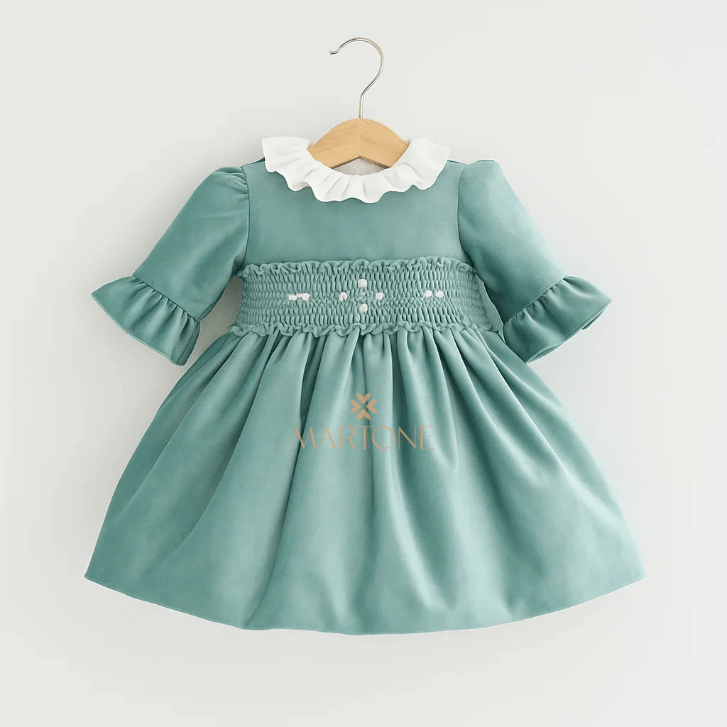 Abito elegante da neonata in velluto lucido verde acqua, con corpetto smock ricamato a mano. Presenta maniche a tre quarti con volant, colletto bianco arricciato e gonna ampia a pieghe. Ideale per cerimonie e occasioni speciali.