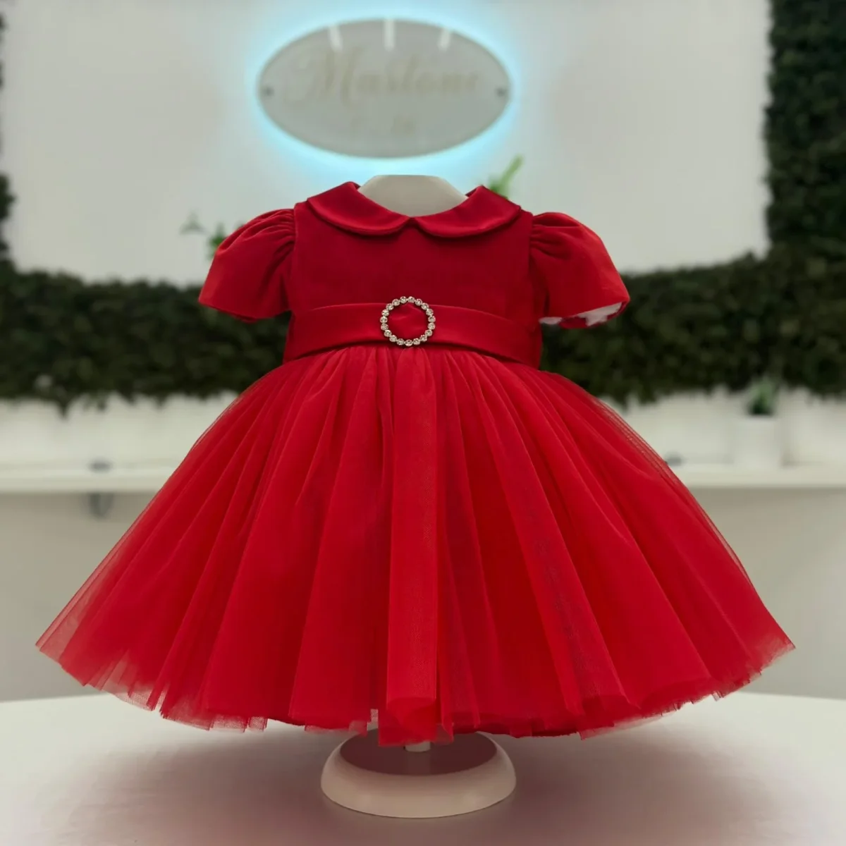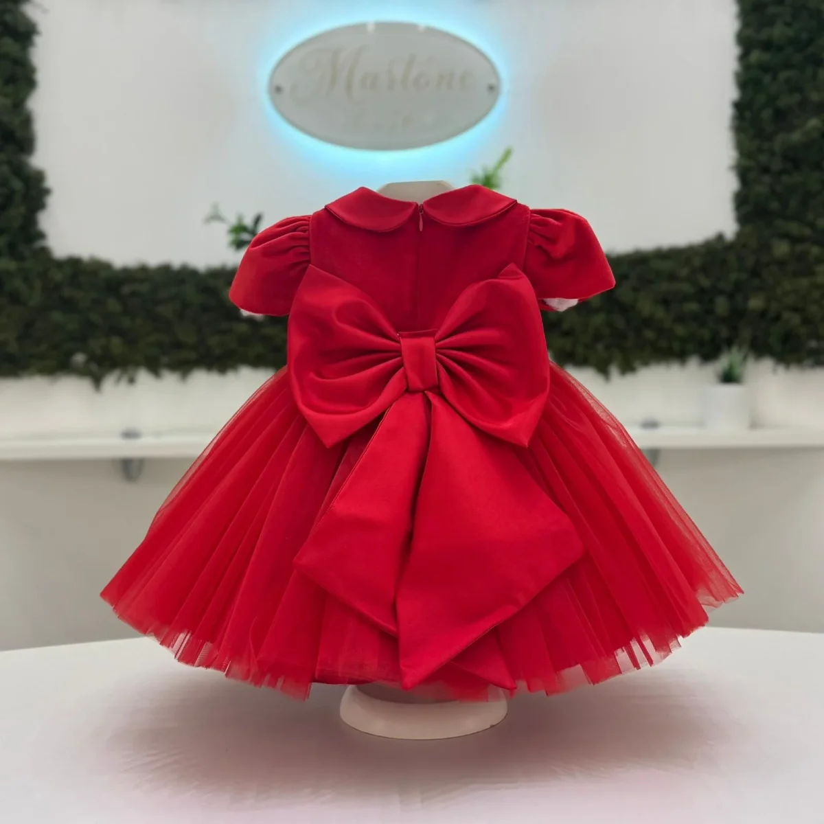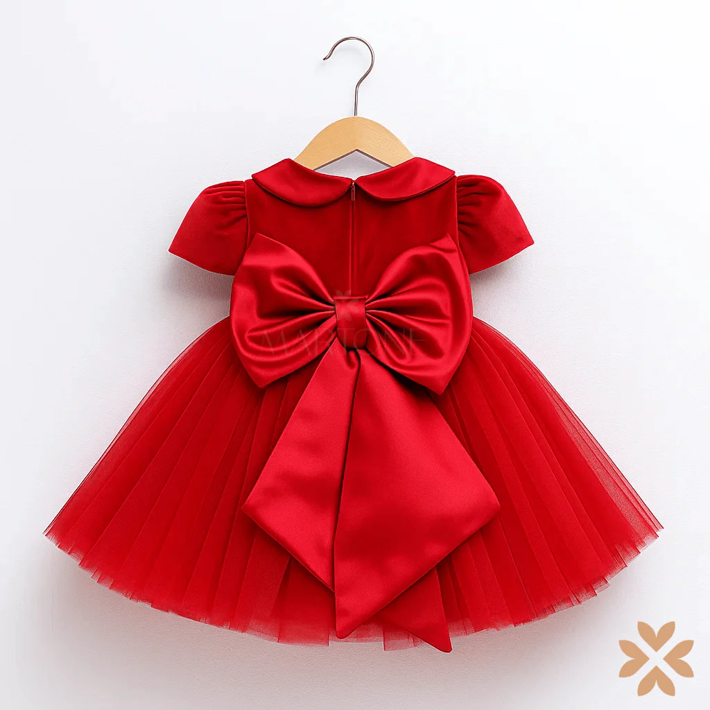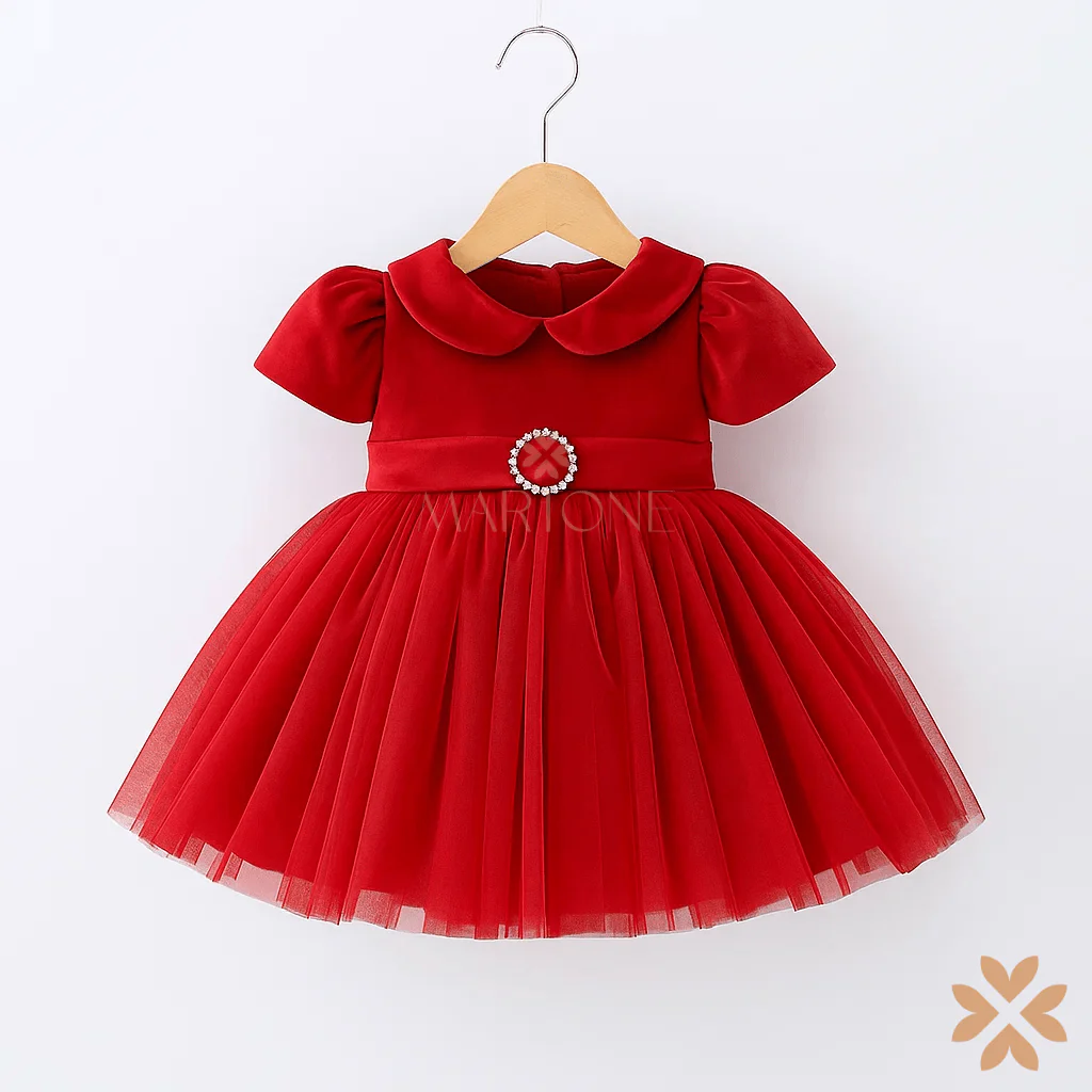 Abito in velluto rosso con corpino a manica corta e colletto arrotondato. La gonna in tulle a più strati dona volume e movimento, mentre la cintura in velluto con fibbia gioiello aggiunge un tocco prezioso. Sul retro, un maxi fiocco completa il modello con eleganza. Perfetto per le occasioni speciali e le festività.