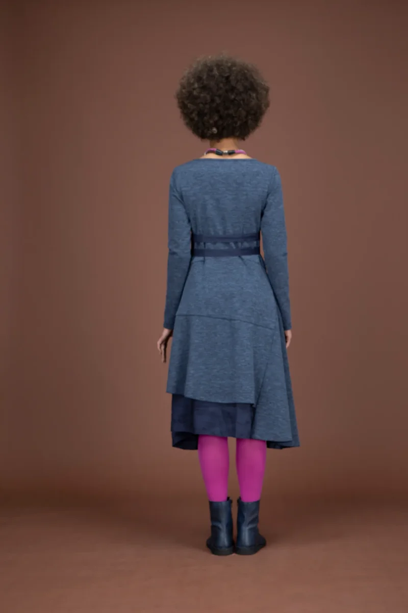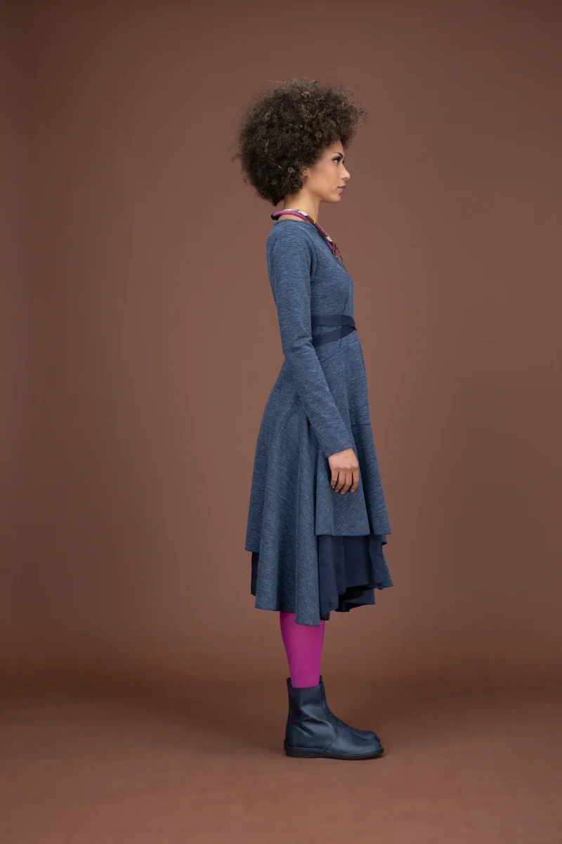 Abito asimmetrico, con balze, in punto Milano.