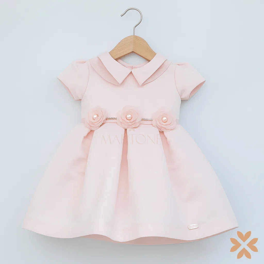 Abitino in satin rosa con maniche corte e colletto tondo, impreziosito da cintura in organza con fiori applicati, perle centrali e catenina decorativa. Le pieghe sul davanti donano volume e delicatezza, ideale per cerimonie e occasioni speciali.