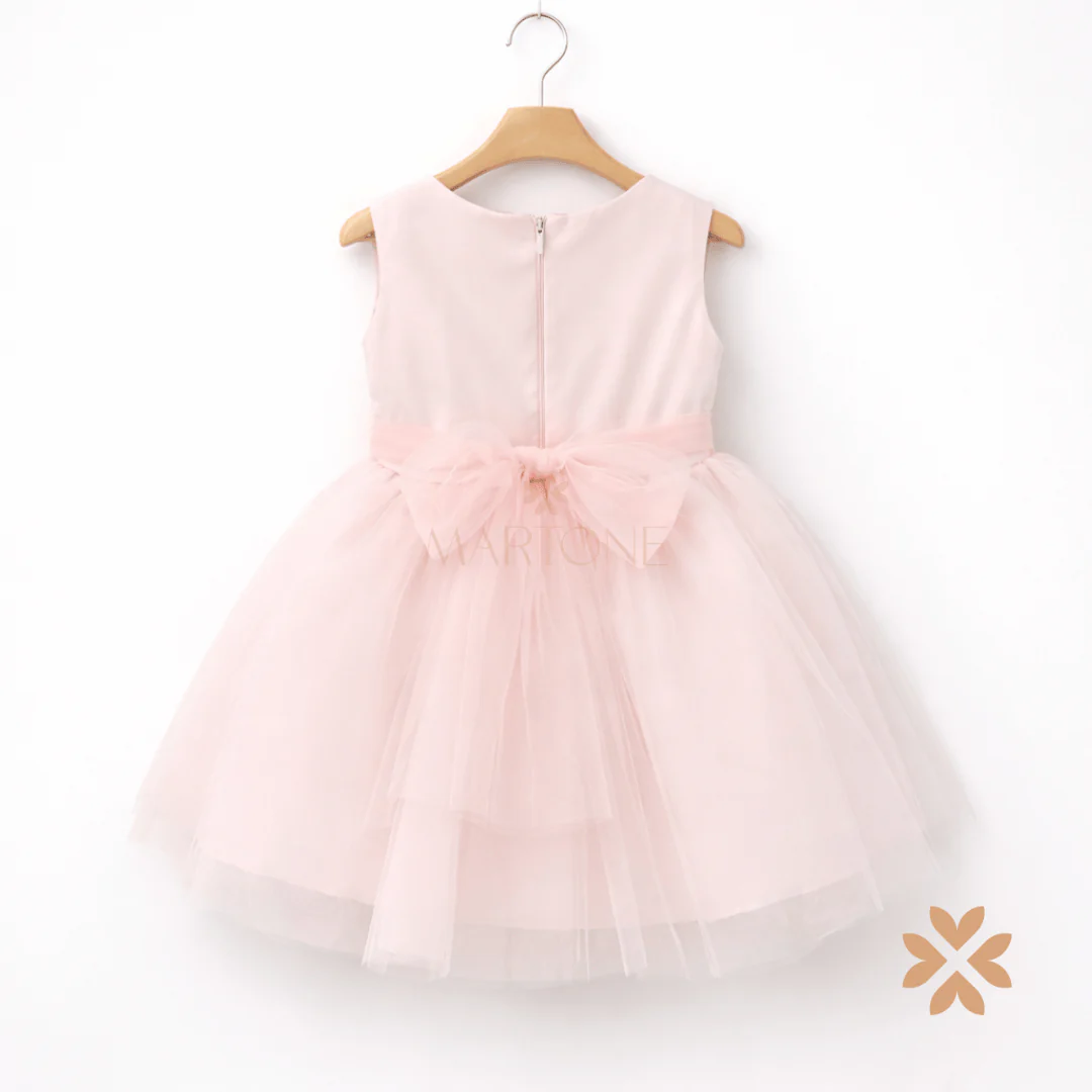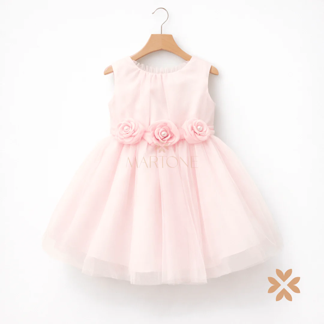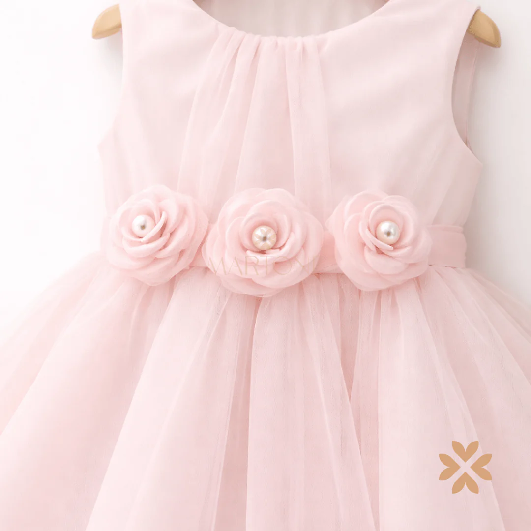 In vita, una cintura impreziosita da delicati fiori in organza rosa, arricchiti da perle centrali, aggiunge un tocco sofisticato e ricercato, esaltando la silhouette con discreta armonia.