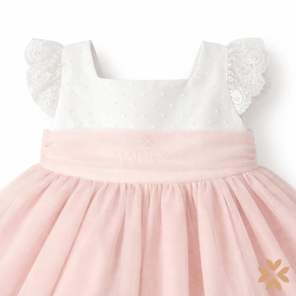 Abito bimba in tulle con corpino a pois, gonna morbida rosa, manica ad aletta in pizzo, chiusura sul retro con fiocco