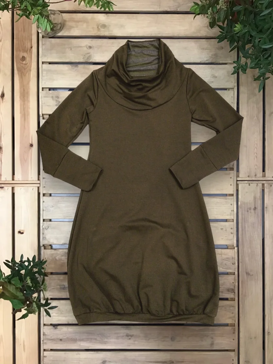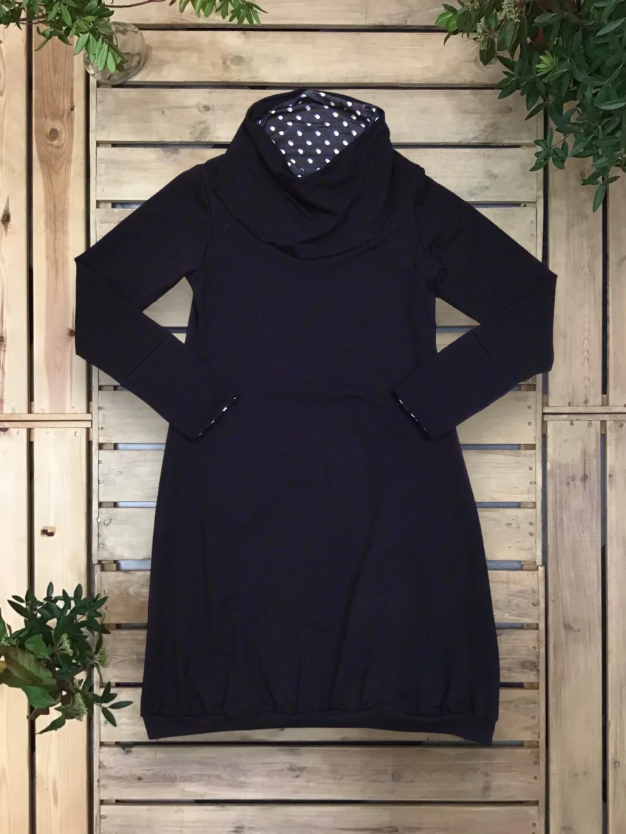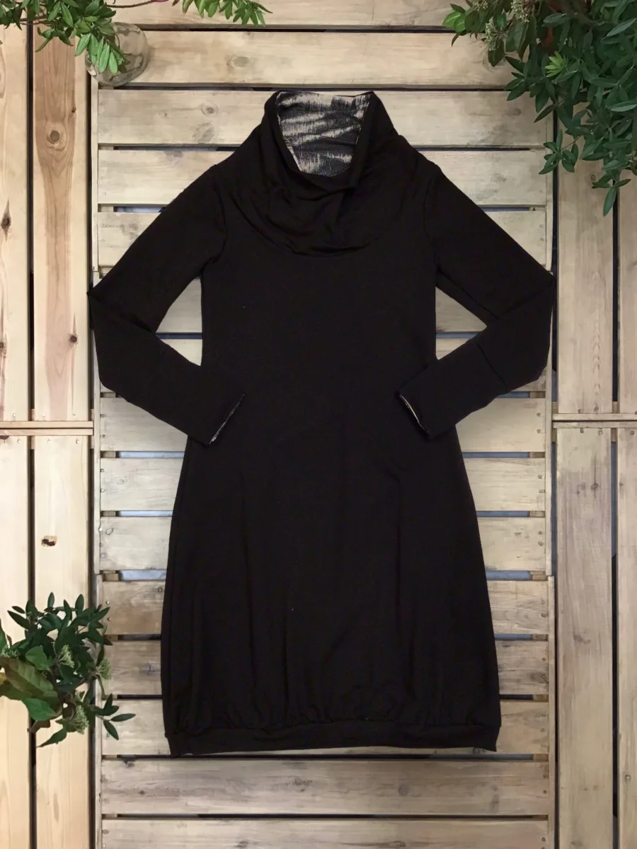 Abito a palloncino arricciato sul fondo con interni del collo e dei polsini in maglina a contrasto.