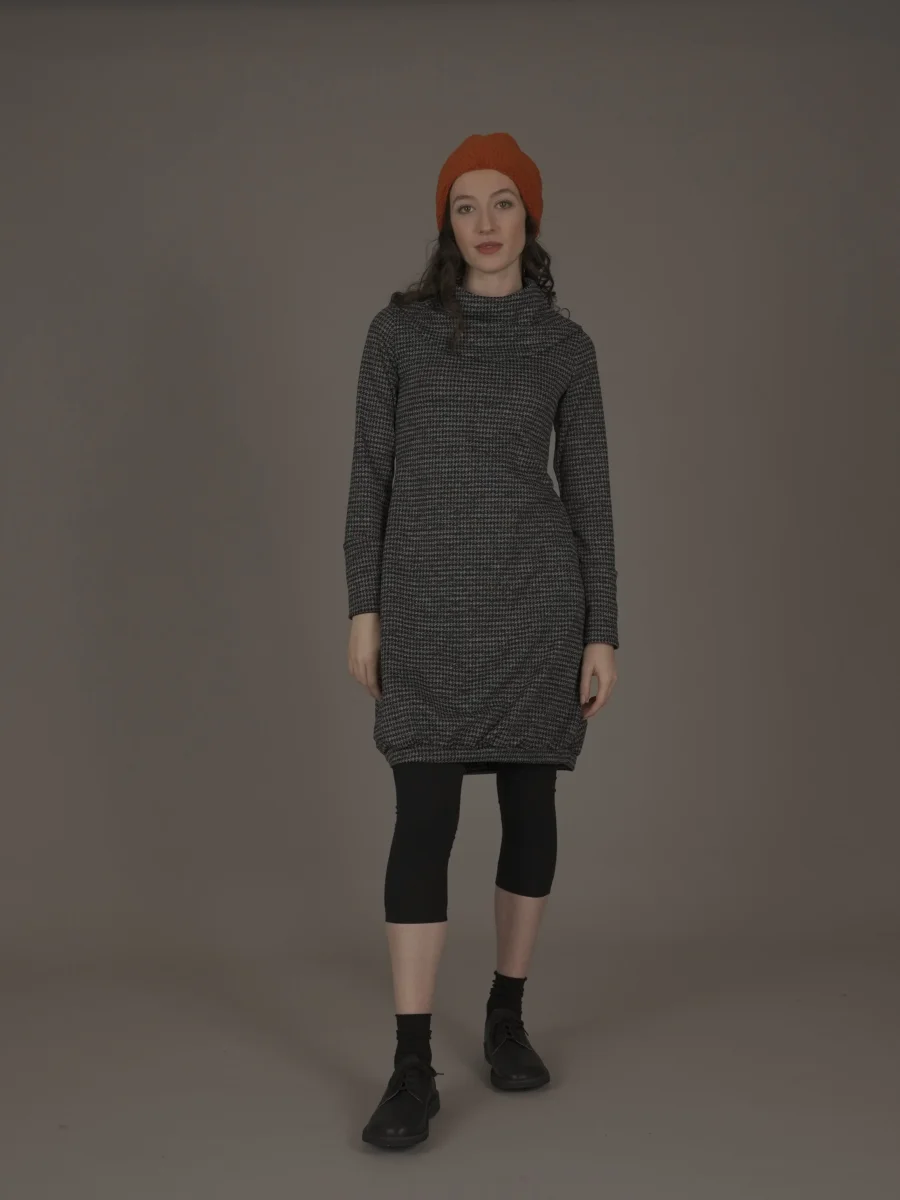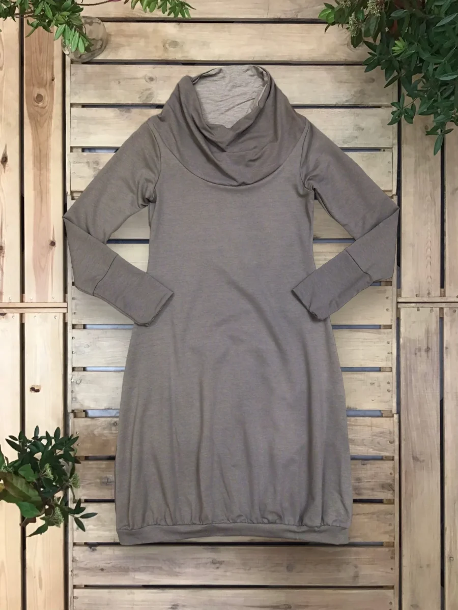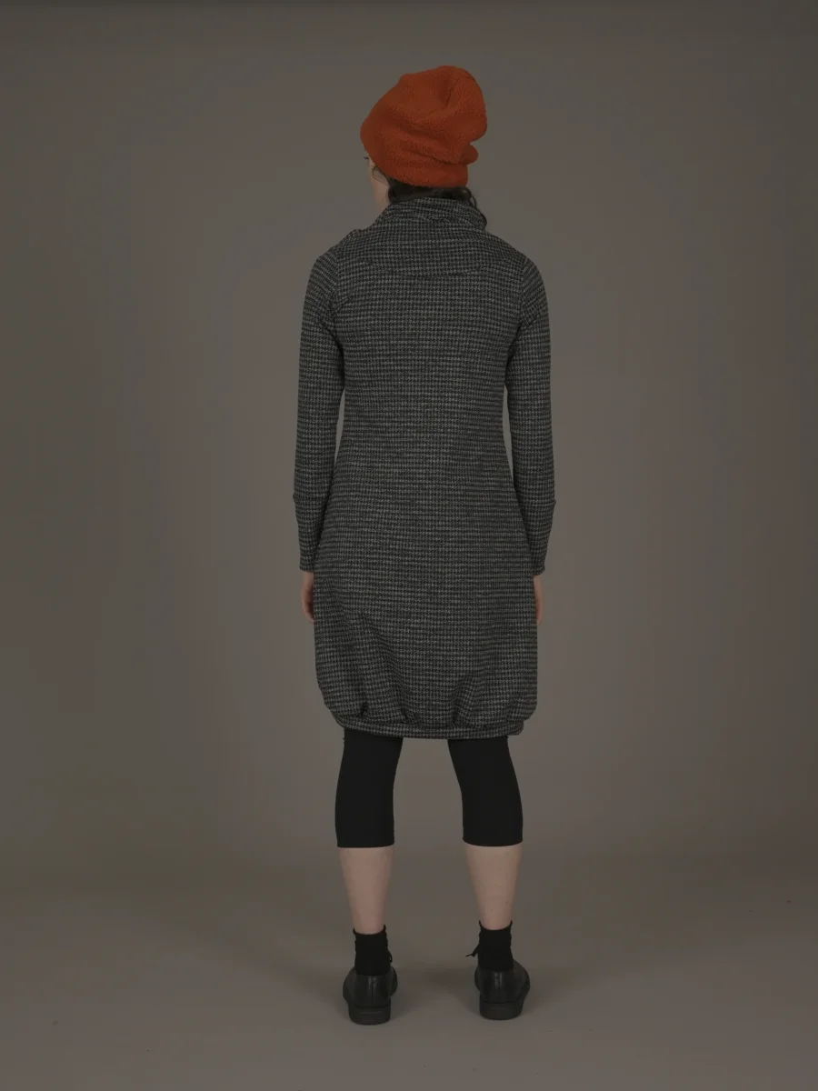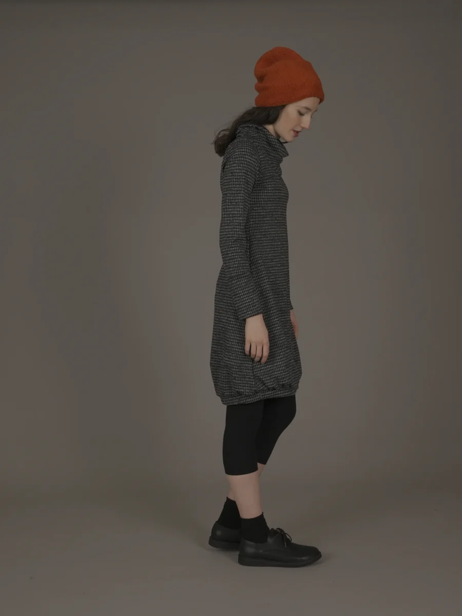 Abito a palloncino arricciato sul fondo con interni del collo e dei polsini in maglina a contrasto.