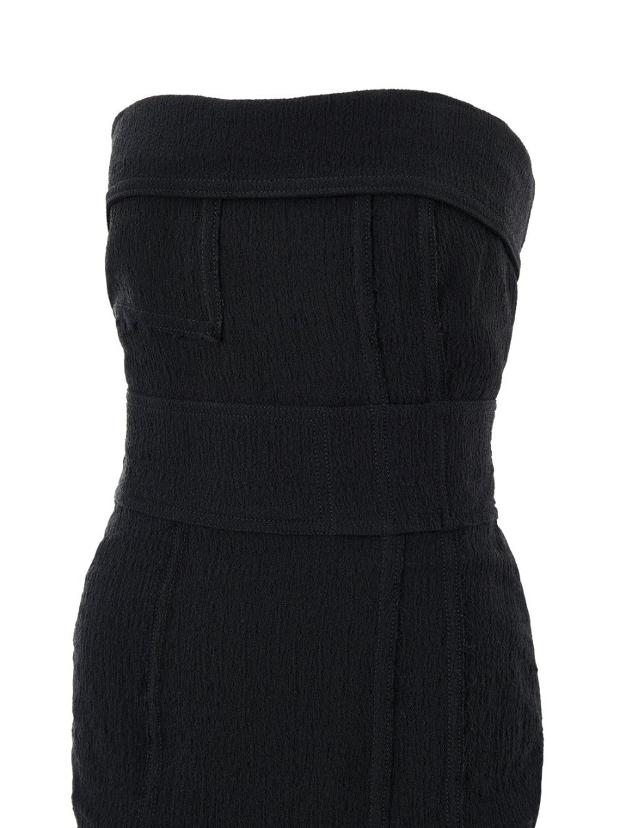 Abito Nero in Viscosa Drappeggiato con Dettaglio Bustier Tom Ford. Modello stretto ed elasticizzato, tessuto doppiato e goffrato, pieghe cucite sul fronte, chiusura posteriore con zip, senza spalline, bustino interno.