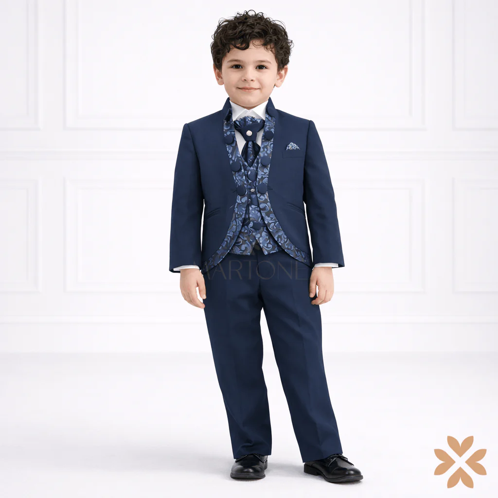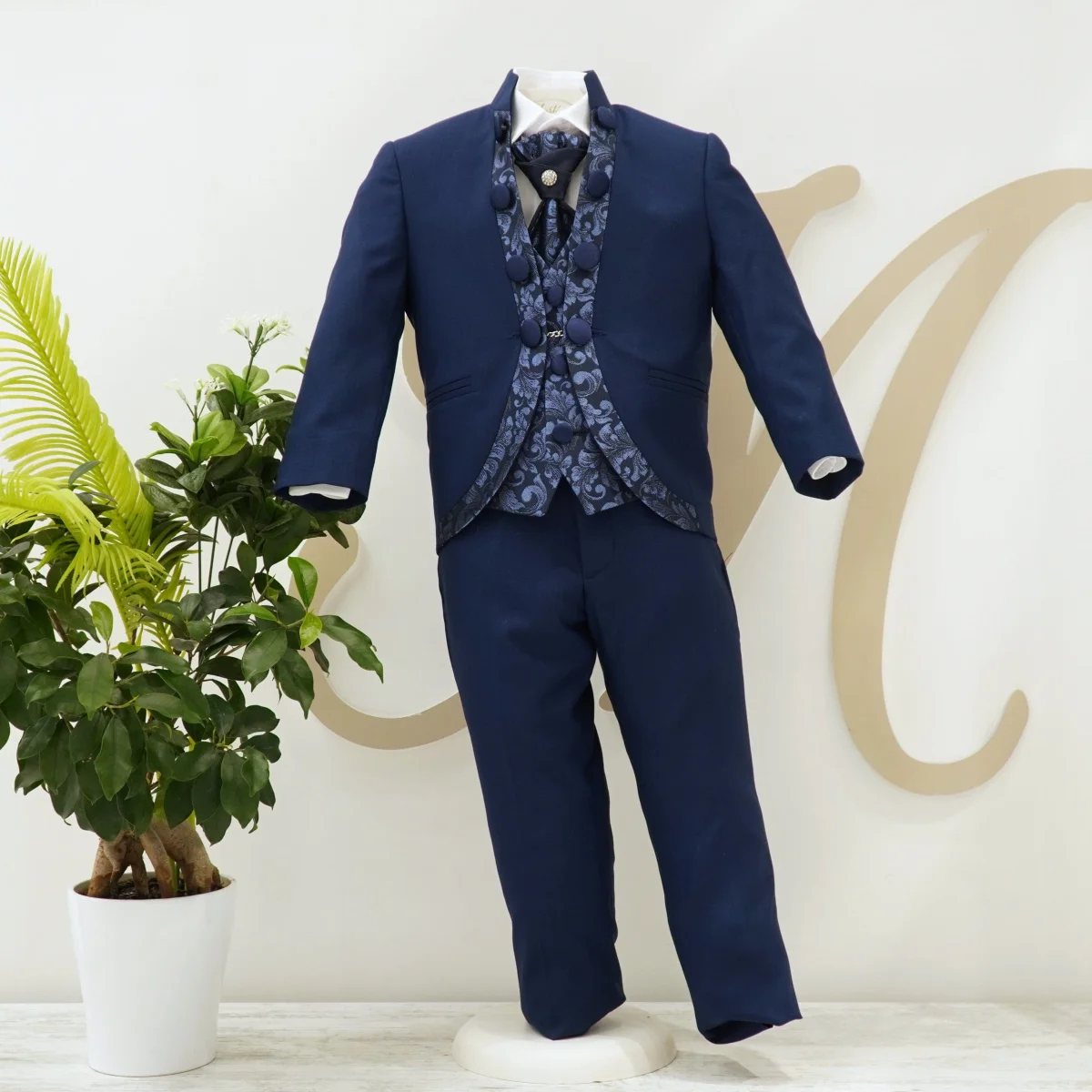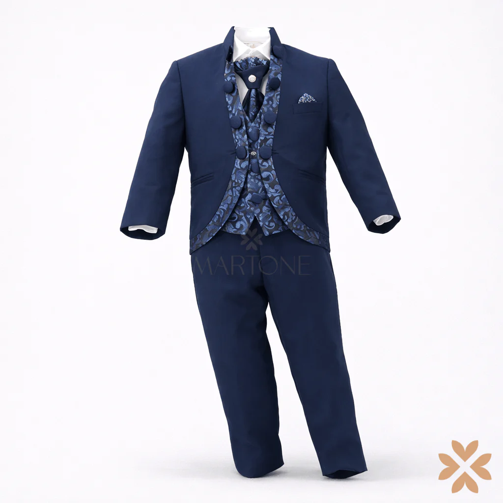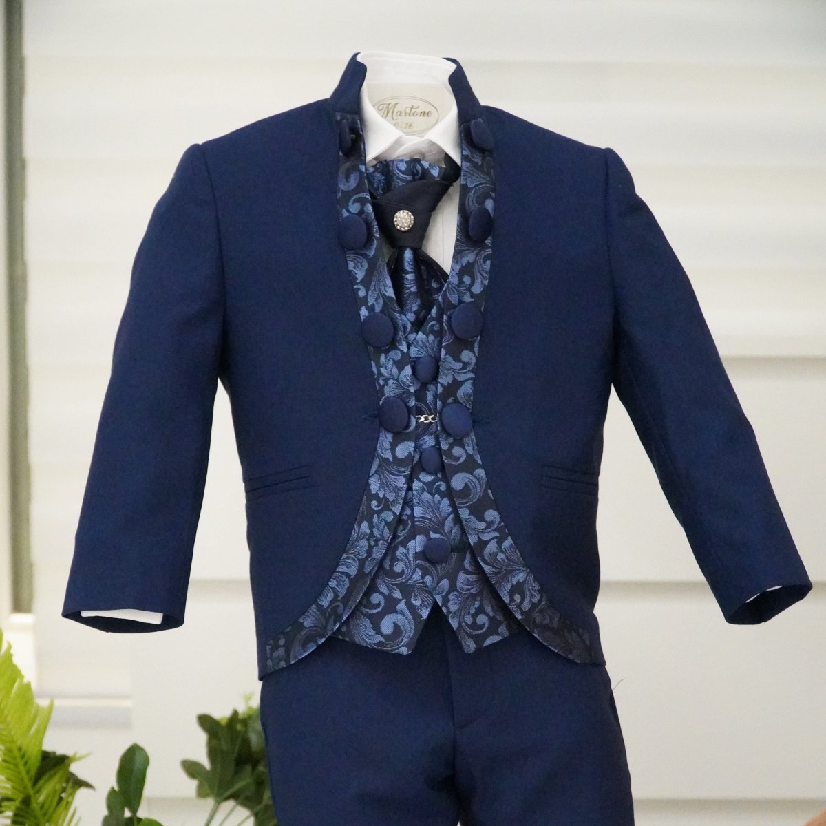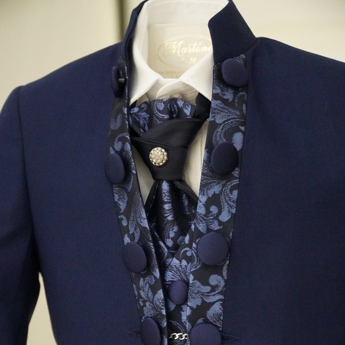 Abito da cerimonia composto da giacca modello coreano con bordi in damascato e bottoni laterali, gilet damascato, pantalone classico liscio, camicia bianca in cotone e plastron con dettaglio gioiello.