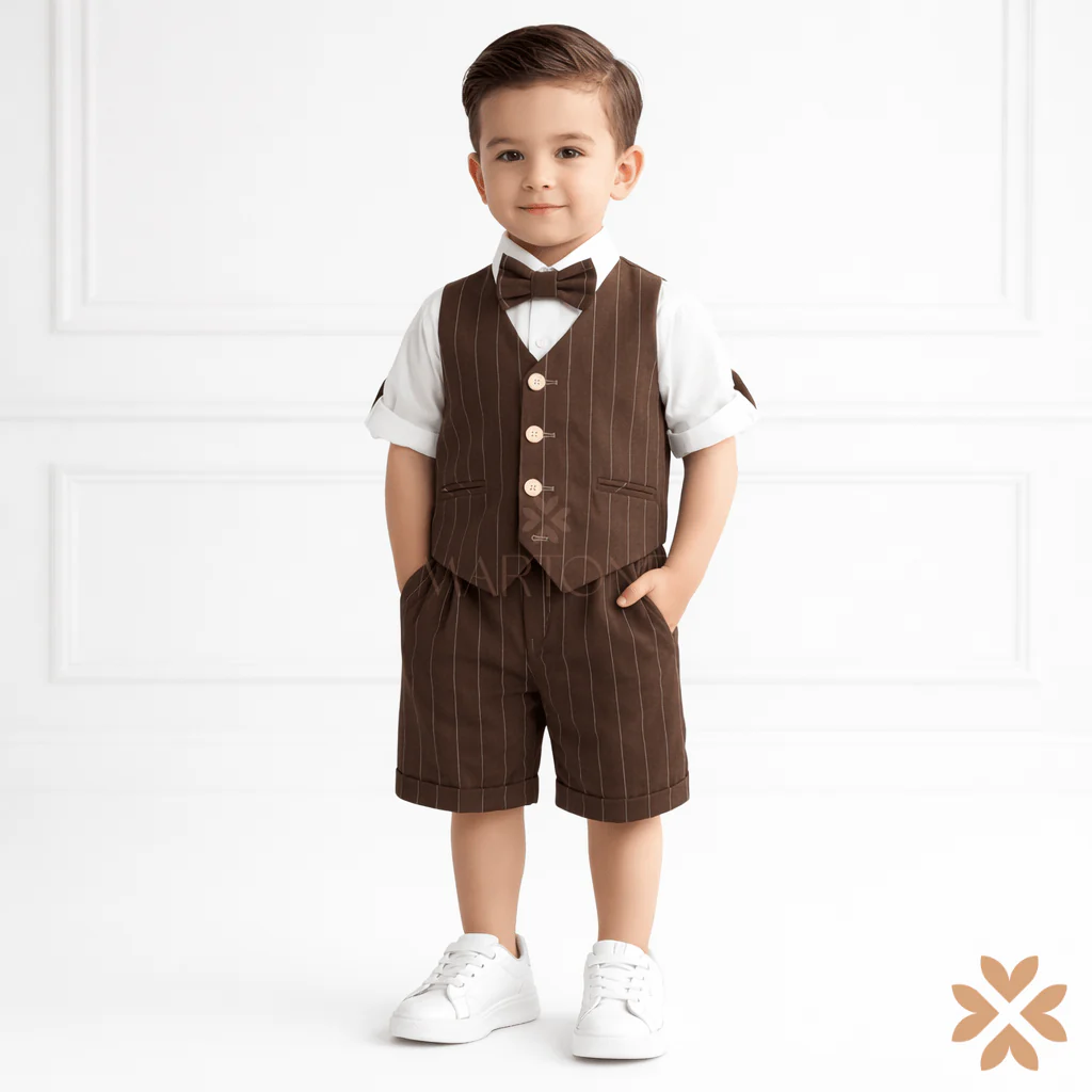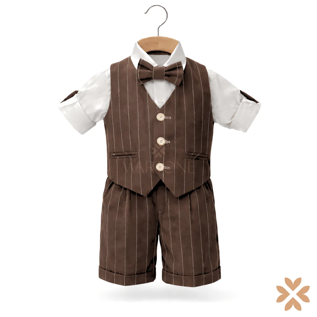 Completo cerimonia bimbo composto da camicia bianca, gilet coordinato, bermuda e papillon abbinato. Il gilet presenta una linea classica con chiusura frontale e tasche a filetto, mentre il bermuda è rifinito con risvolto per un look curato e moderno. Colore Marrone Moka nuovo trend estivo. Un completo raffinato, ideale per battesimi, cerimonie ed eventi speciali.