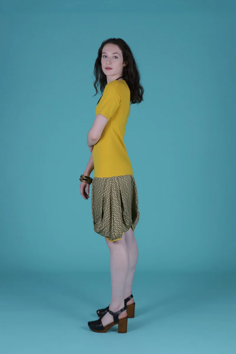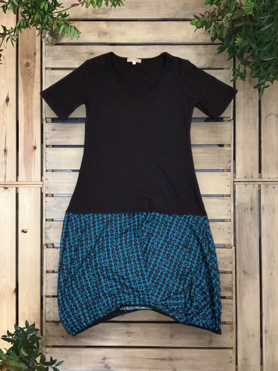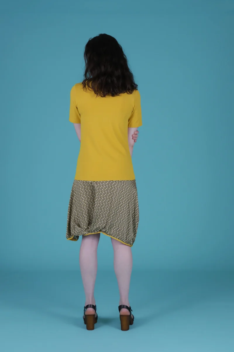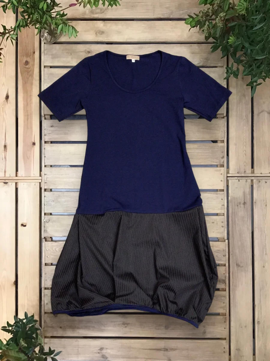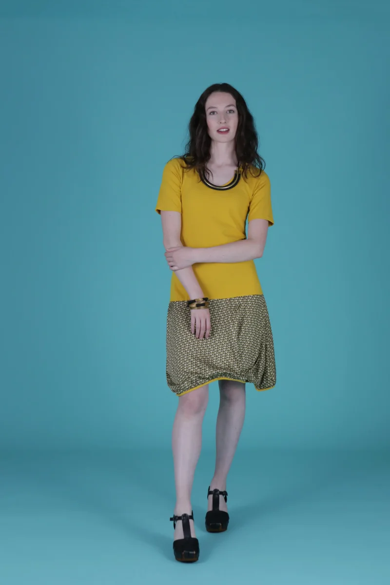 Abito in jersey di cotone con fondo in tessuto a contrasto, taglio a palloncino.