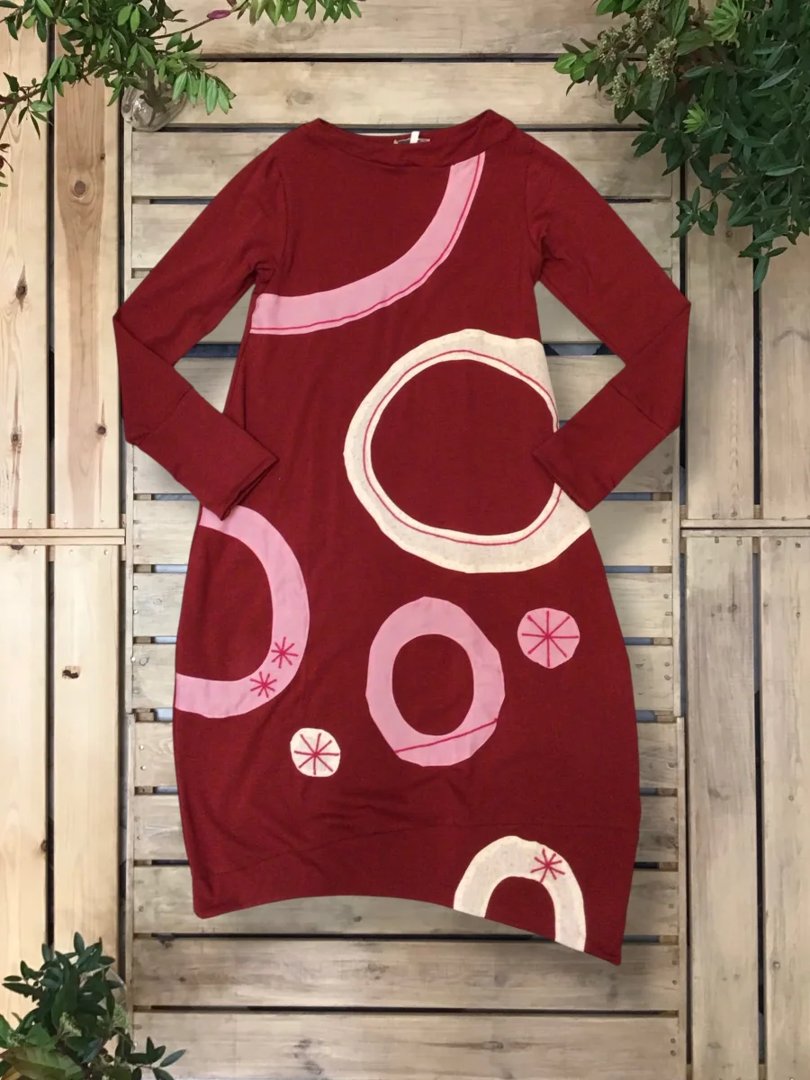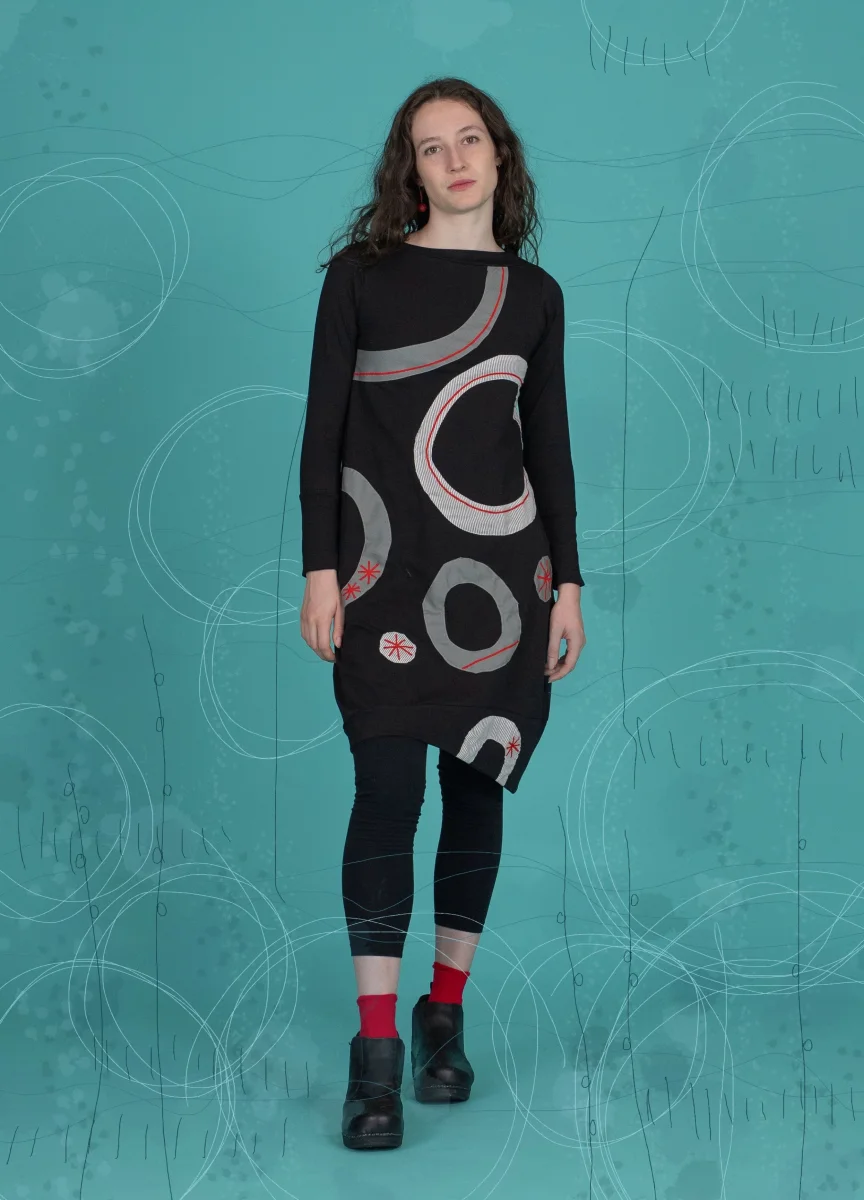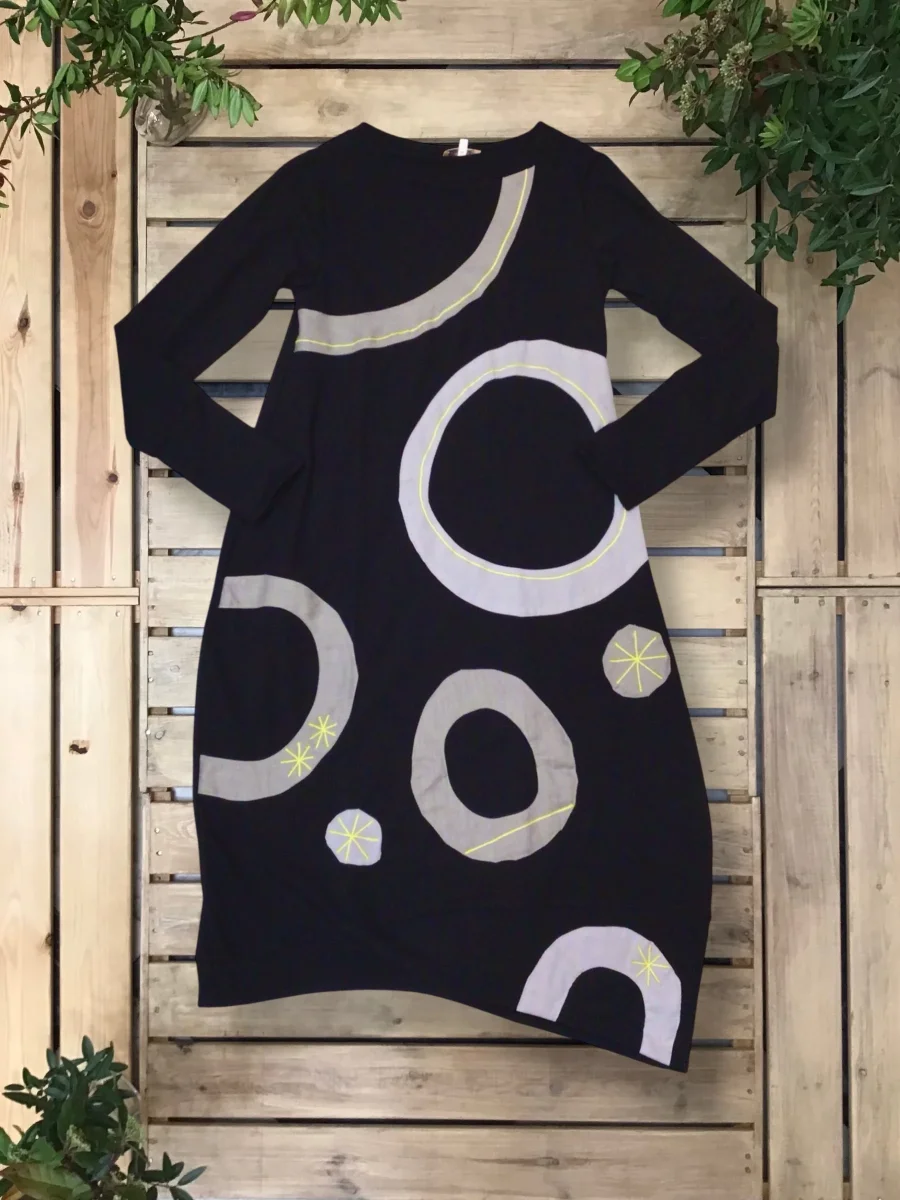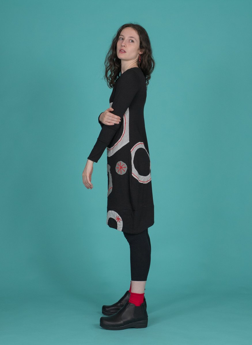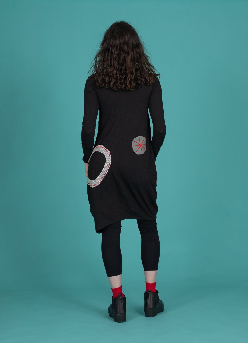 Abito asimmetrico in jersey, con applicazioni di tessuto e filo di lana a contrasto.
